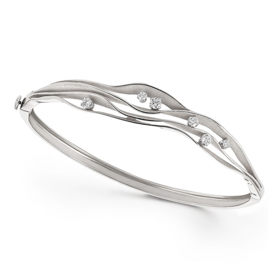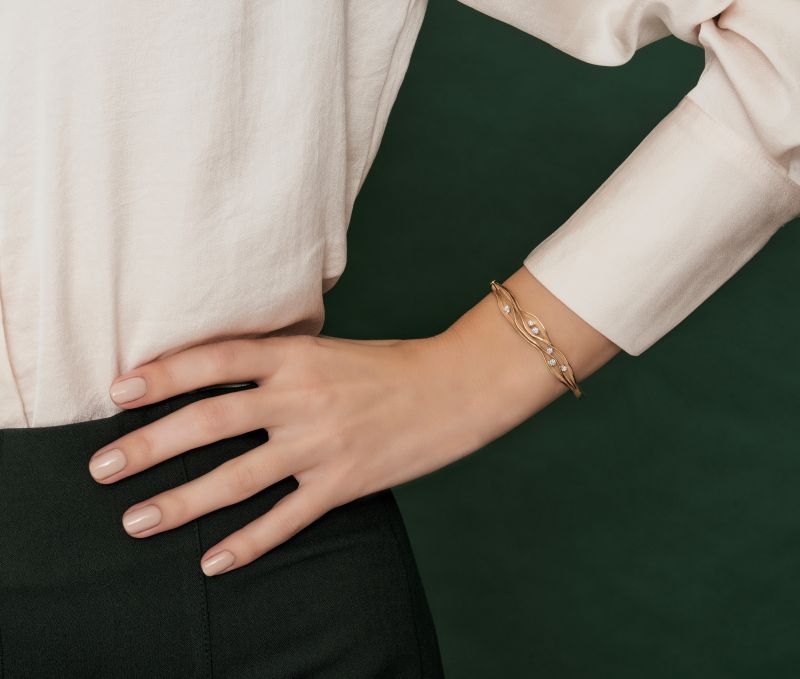 Zlatna narukvica sa dijamantima koja dolazi iz Annamaria Cammilli radionice. Izrađena je od najkvalitetnijeg 18K belog zlata a krasi je čak 6 dijamanata. Neobičnog je oblika i podseća na talase vode ili pesak u pustinji.