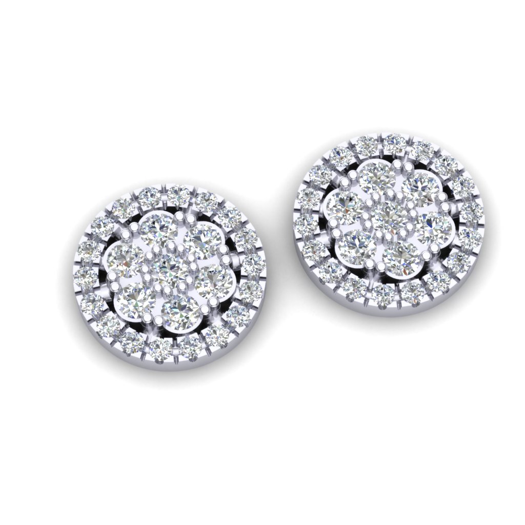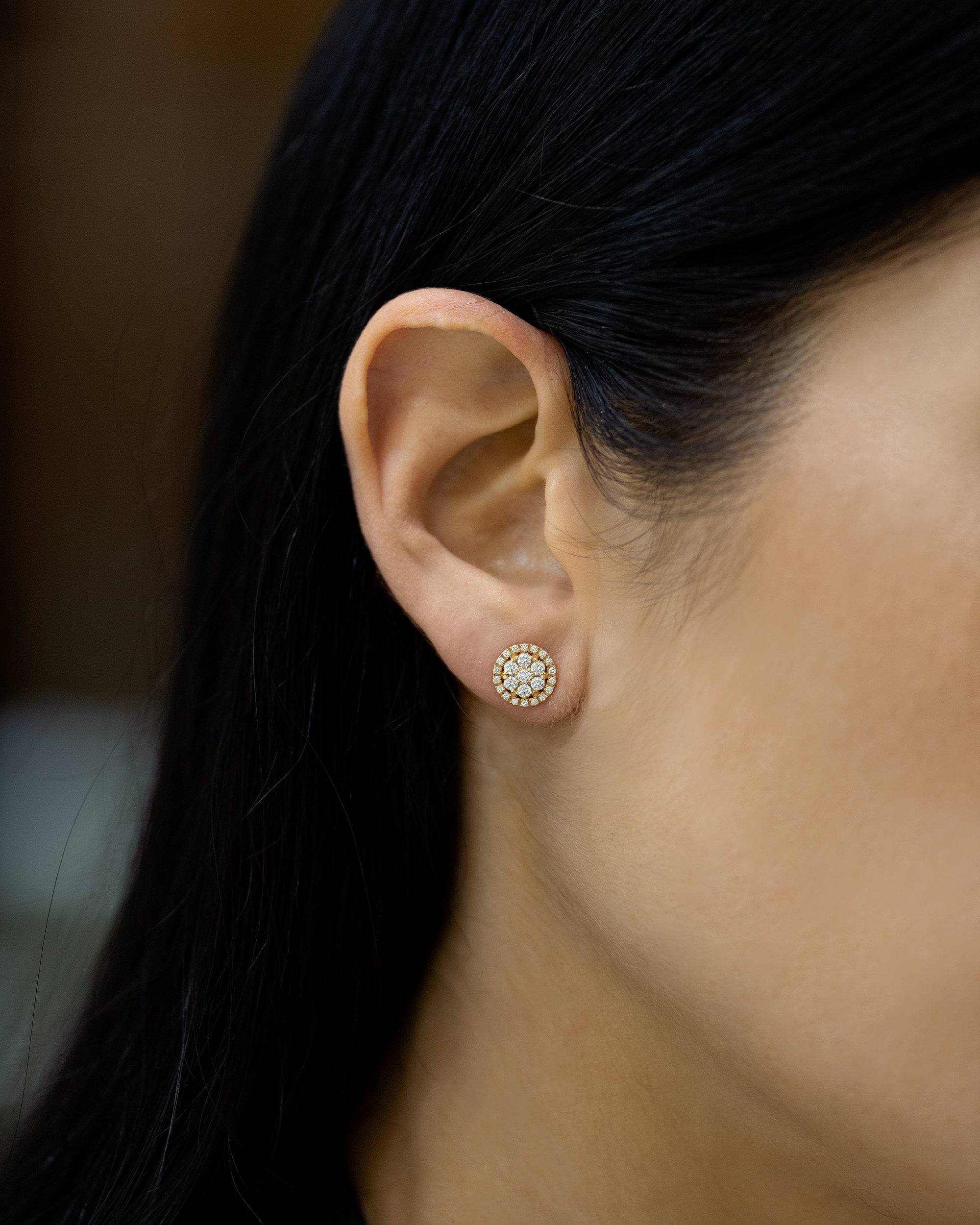 Minđuše od zlata bogato optočene brilijantima. Ove raskošne zlatne minđuše se pričvršćuju šrafićima, dok je čak 50 brilijanata ufasovano u okruglu zlatnu osnovu. Brilijanti su kreativno ufasovani u obliku cveta tako da ostavljaju utisak da je u pitanju kamenje znatno veće karataže. U zlatari Andrejević, nudimo Vam mogućnost da sami izaberete karatažu, čistoću i boju dijamanta, kao i boju zlata, kako biste bili sigurni da će krajnji rezultat biti upravo minđuše kakve ste želeli.