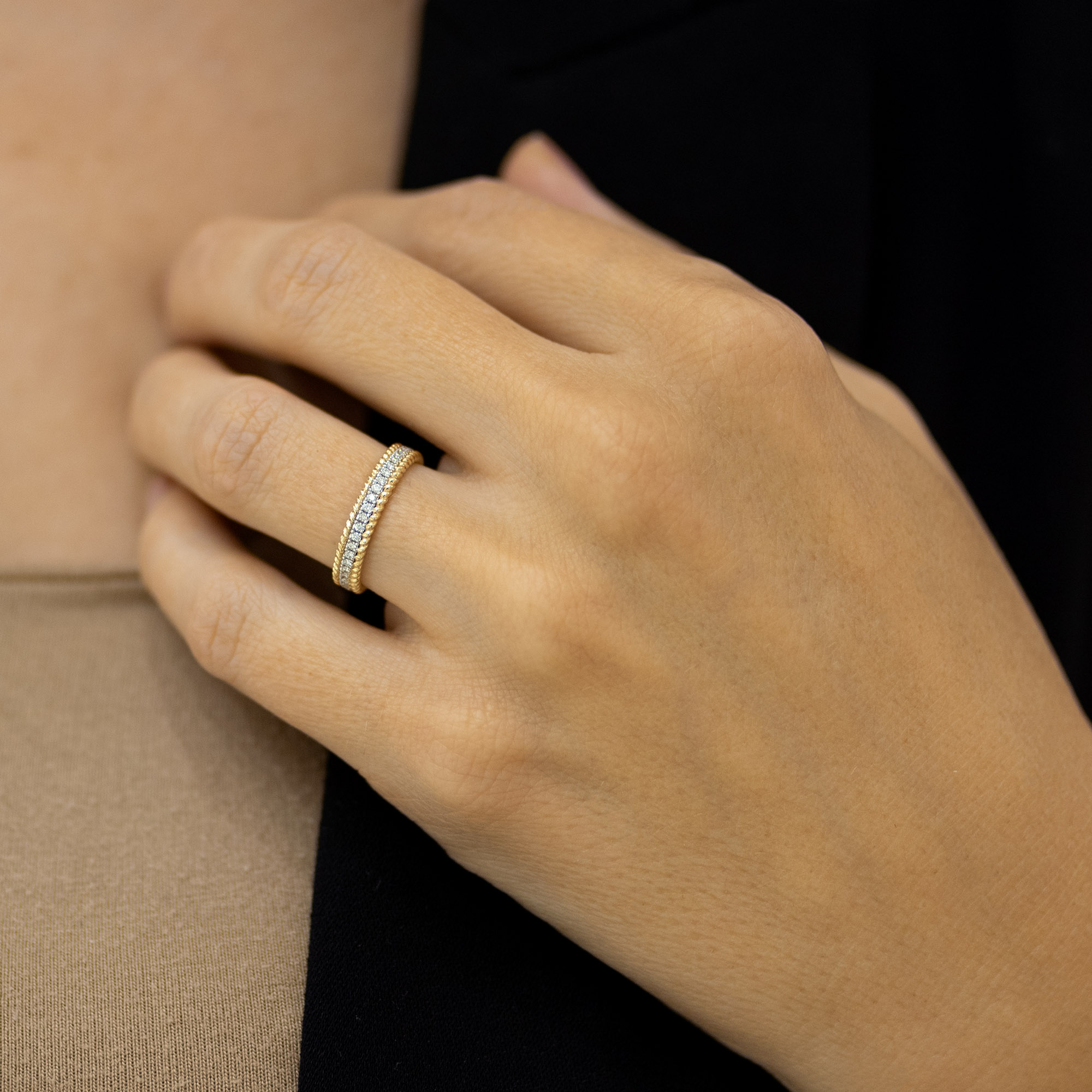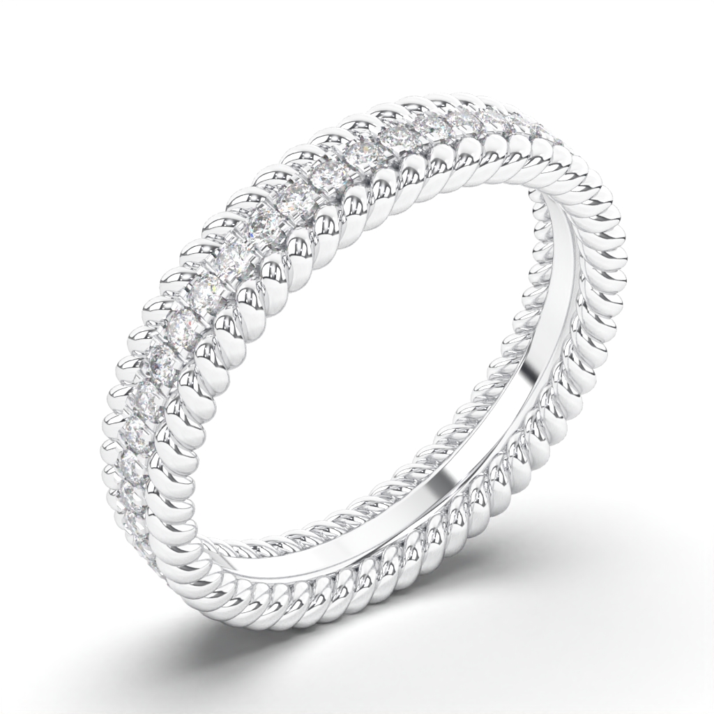 Elegatna prsten burma eternity dizajna, ukrašena dijamantima. Zahvaljujući ukrasima, pravo je taktilno remek-delo: dok su po sredini burme ufasovani dijamanti, sa svake strane dijamantskog pojasa nalazi se spirala od zlata, što ovu prsten burmu čini nezaborvanom na prvi pogled, ali i prvi dodir. Majstorska ugradnja dijamanata čini svaku prsten burmu malim umetničkim delom. Prstenje zlatare Andrejević može biti izrađeno u bilo kojoj od 3 boje zlata: beloj, roze, ili žutoj.