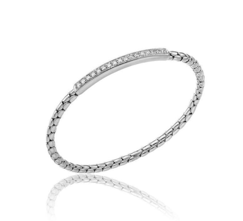 Narukvica od zlata sa dijamantskim detaljem koja dolazi iz Chimento radionice. Ova narukvica izrađena je od najkvalitetnijeg 18K belog zlata a krasi je centralni ukras u obliku duguljaste pločice u koju su po širini ufasovani dijamanti. Narukvica je sastavljena od uklopljenih zlatnih elemenata koji joj daju izgled pletenice ili raskošne zlatne mreže.