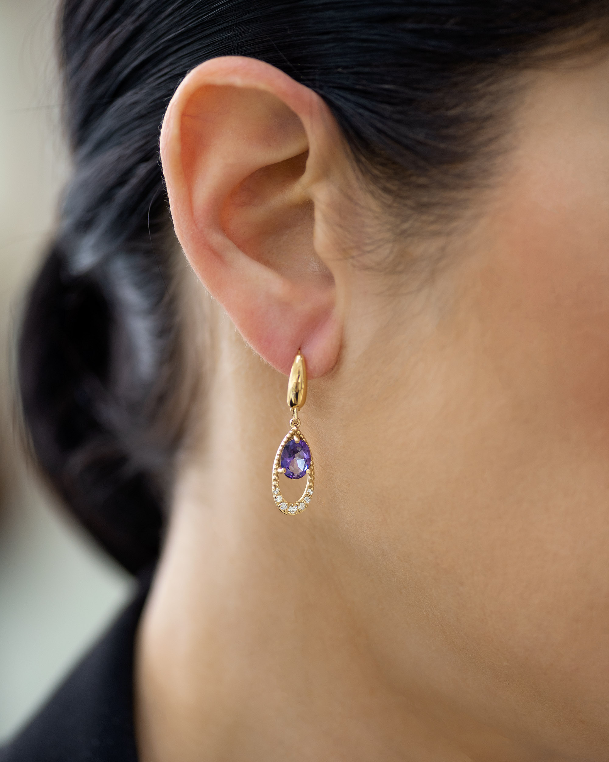 Viseće minđuše od zlata klasičnog dizajna sa dijamantima i topazima. Minđuše su napravljene od kvalitetnog 14-karatnog zlata i kopčaju se na francusku kopču. Ispod udice je zlatna osnova u obliku suze, šuplje unutrašnjosti, u kojoj je topaz. Sama zlatna osnova je ukrašena dijamantima i sitnim zlatnim kuglicama. U zlatari Andrejević, moguća je i izrada nakita po Vašoj želji, kao i mogućnost konfigurisanja, pa naše zlatne minđuše mogu biti izrađene u bilo kojoj od 3 boje zlata: beloj, roze, ili žutoj. Uz to, u zlatari Andrejević, nudimo Vam mogućnost da sami izaberete karatažu, čistoću i boju dijamanta i drugog dragog kamenja, kako biste bili sigurni da će minđuše biti upravo onakve kakve ste želeli.