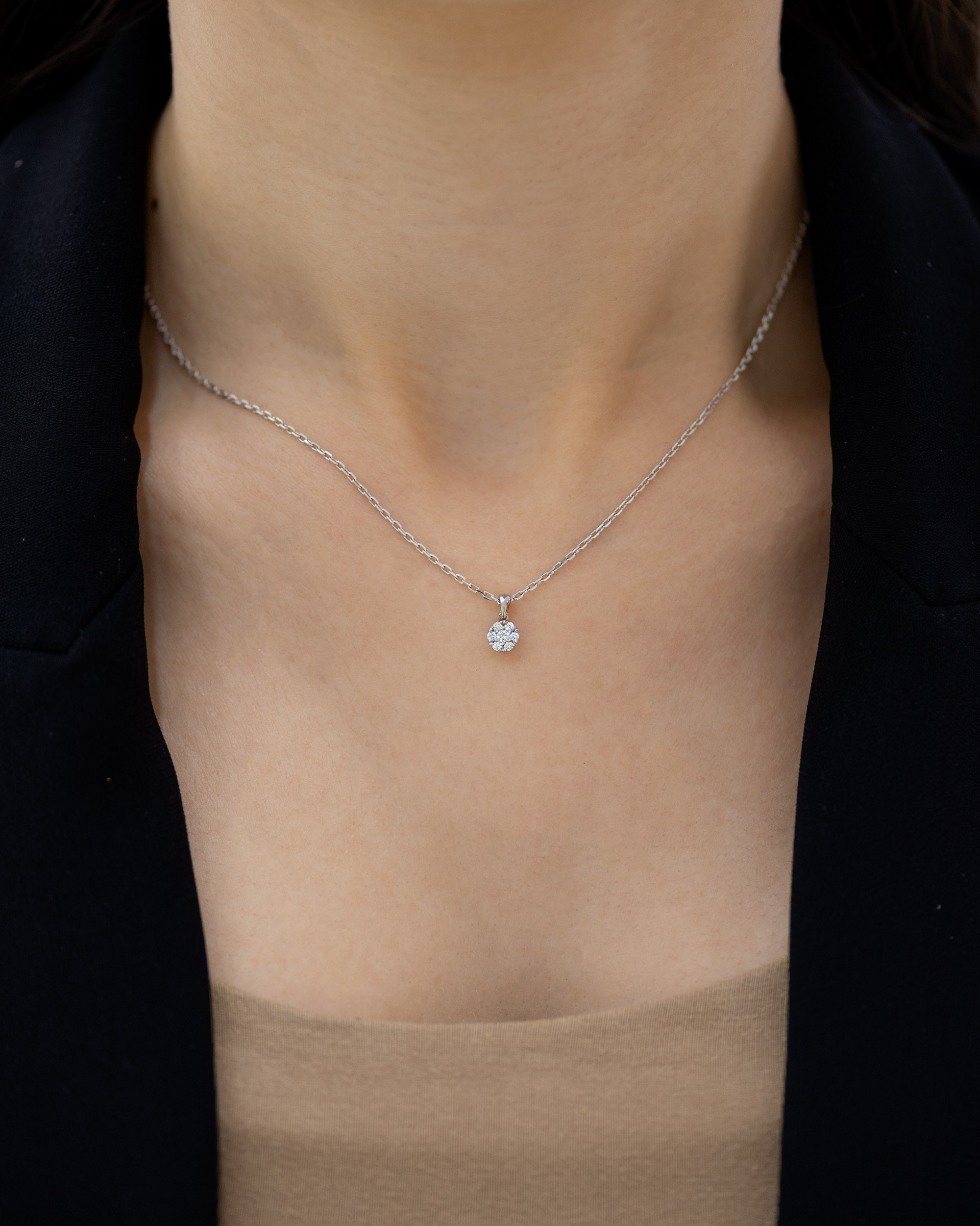 Privezak od zlata koji krasi čak sedam blistavih dijamanata postavljenih tako da daju oblik cveta. Privezak je izrađen od zlata izuzetnog kvaliteta i ima klasičnu alku kroz koju može da prođe tanki lančić. Centralni brilijant je neznatno veće karataže, a okružuje ga šest manjih postavljenih u krug tako da nalikuju svetlucavom cvetu. Zlatni privesci zlatare Andrejević mogu biti izrađeni u bilo kojoj od tri boje zlata: beloj, roze, ili žutoj. Uz to, u zlatari Andrejević, nudimo Vam mogućnost da sami izaberete karatažu, čistoću i boju dijamanta kako biste bili sigurni da će privesci biti upravo onakvi kakve ste želeli.