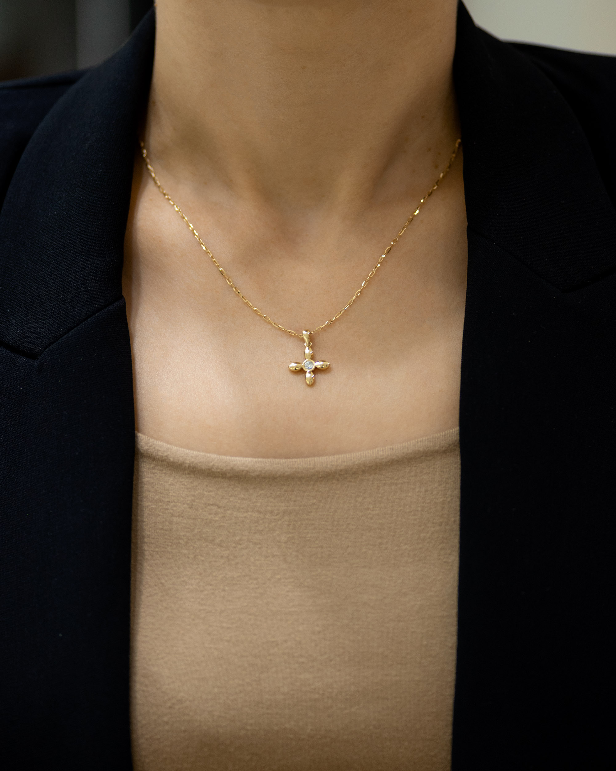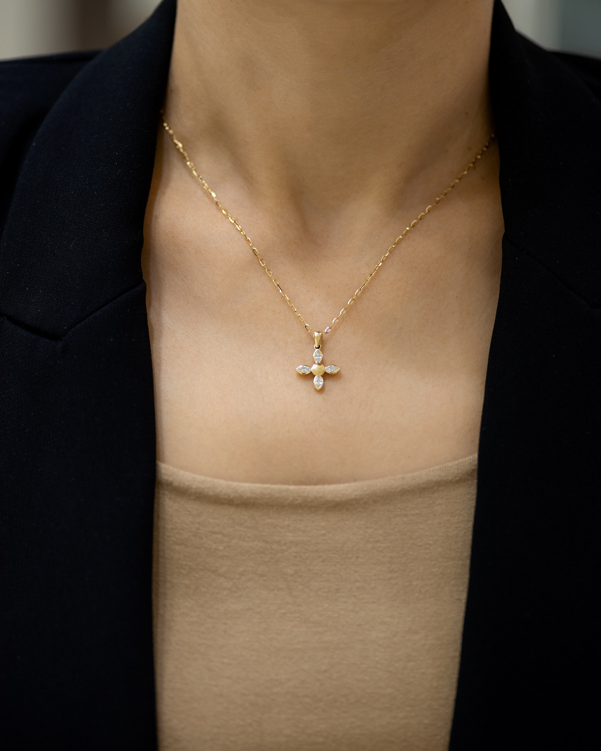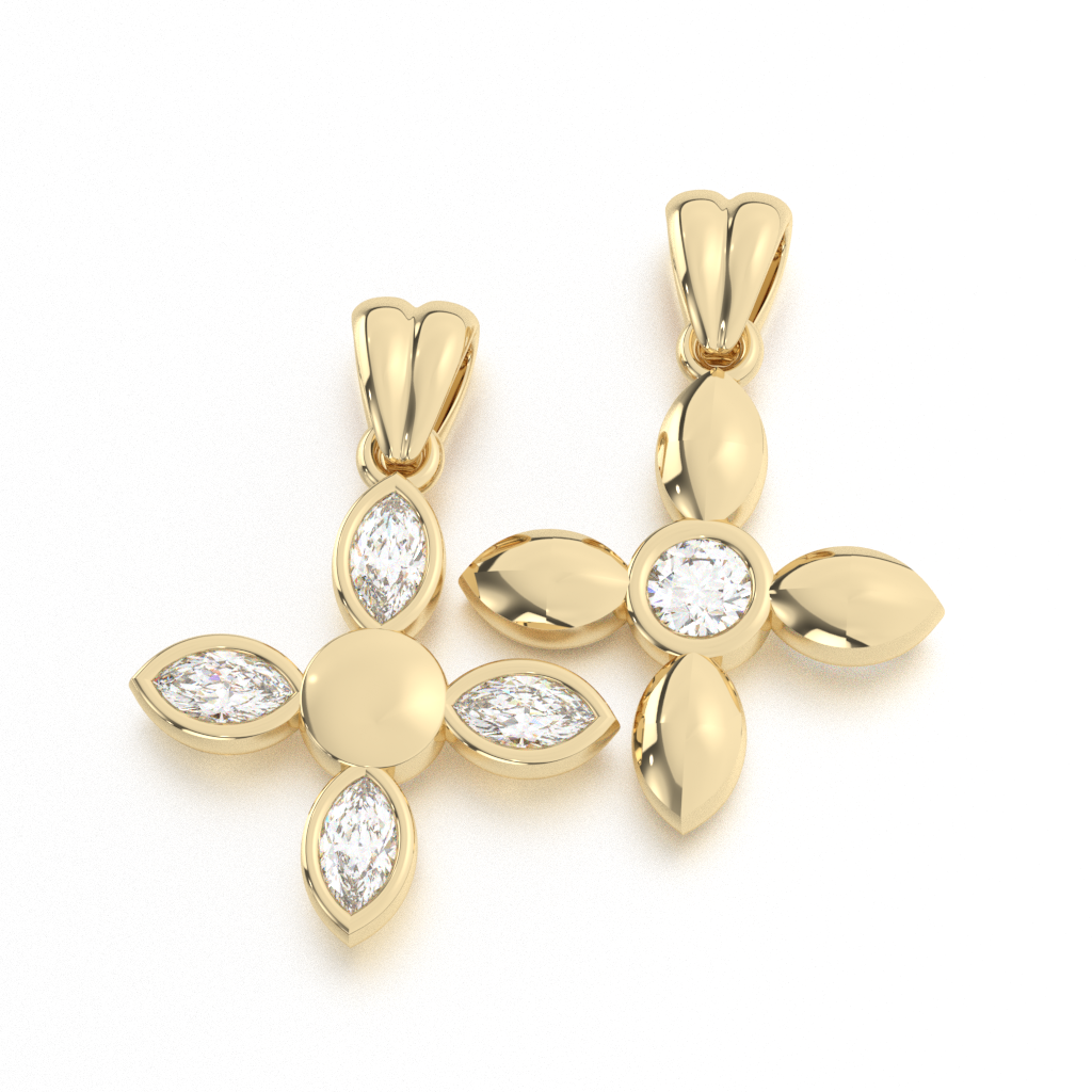 Roze zlato oblikovano je u cvet sa četiri latice. Cvet je krstastog oblika, a na mestu susreta latica utisnut je jedan brilijant. Sa druge strane su sada latice cveta te koje najviše blistaju, zahvaljujući četiri marquise dijamanta.