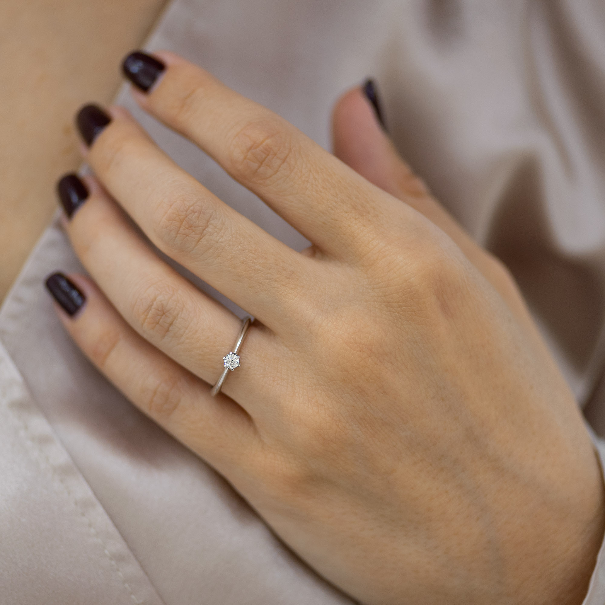 Dijamantski prsten soliter oblih ivica i svedenog, klasičnog dizajna. Napravljen je od najkvalitetnijeg 14-karatnog zlata ispoliranog do savršenstva. Brilijant pridržava šest držača ravno brušenih vrhova i ivica koje dodatno reflektuju svetlost, čineći prsten još sjajnijim. U zlatari Andrejević, nudimo Vam mogućnost da sami izaberete karatažu, čistoću i boju dijamanta, kao i boju zlata, kako biste bili sigurni da će krajnji rezultat biti upravo dijamantski prsten kakav ste želeli.