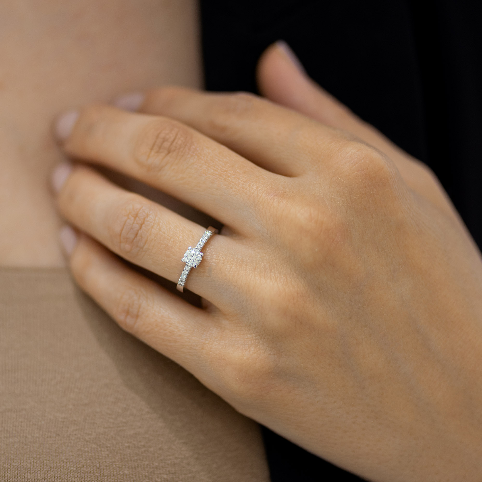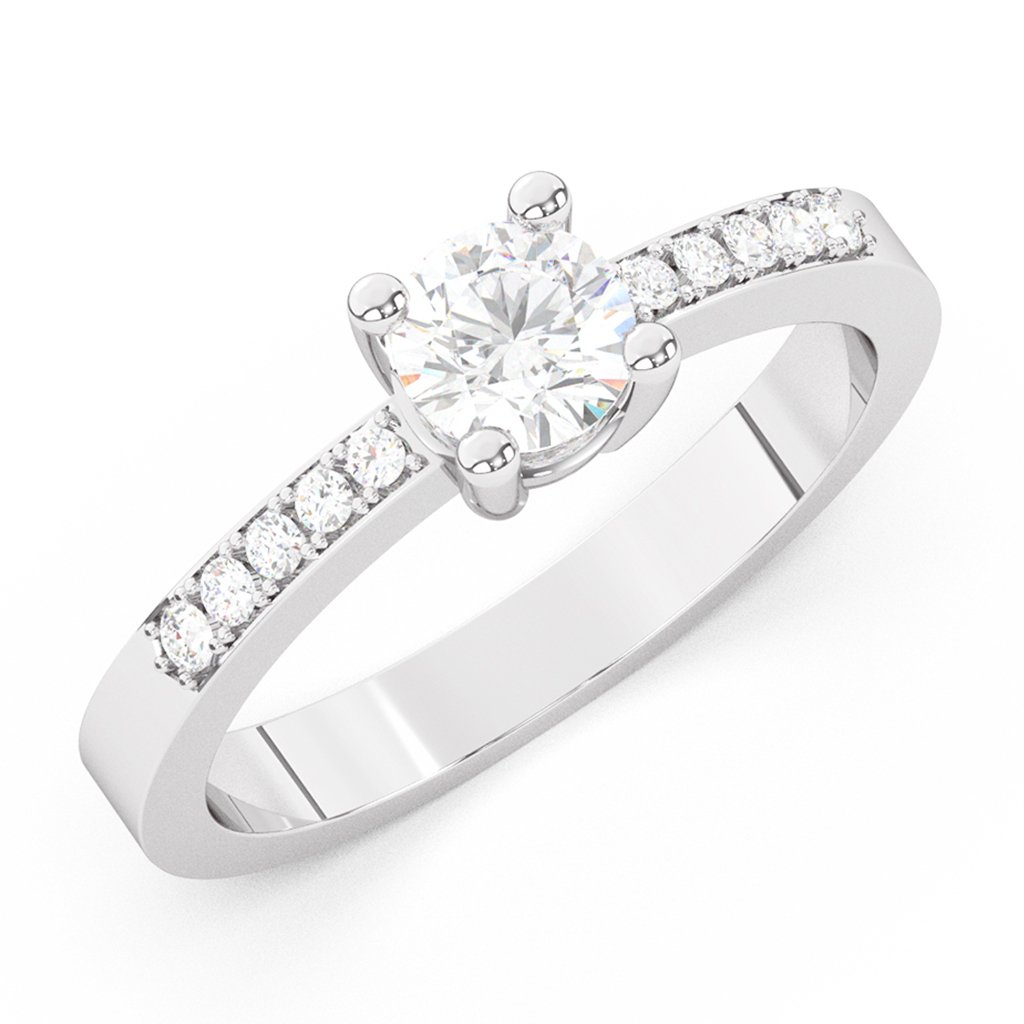 Dijamantski prsten klasičnog dizajna ukrašen sa čak 11 brilijanata. Kružnica prstena ima oštre ivice koje lepo reflektuju svetlo. Sa svake strane većeg centralnog dijamanta nalazi se po pet manjih od kojih svaki ima po četiri držača. Manji dijamanti su usađeni duboko u kružnicu prstena. Centralni dijamant je veće karataže i osiguran je sa četiri držača oblo brušenih vrhova. GIA sertifikat koji prati ovaj prirodni dijamant garantuje tačnost navedenih podataka. Za bogati efekat odblesaka svetlosti su zaslužne idealne proporcije dijamanta i perfektna obrada prstena. Sam prsten može biti napravljen od belog, roze ili žutog zlata, finoće 14k ili 18k.