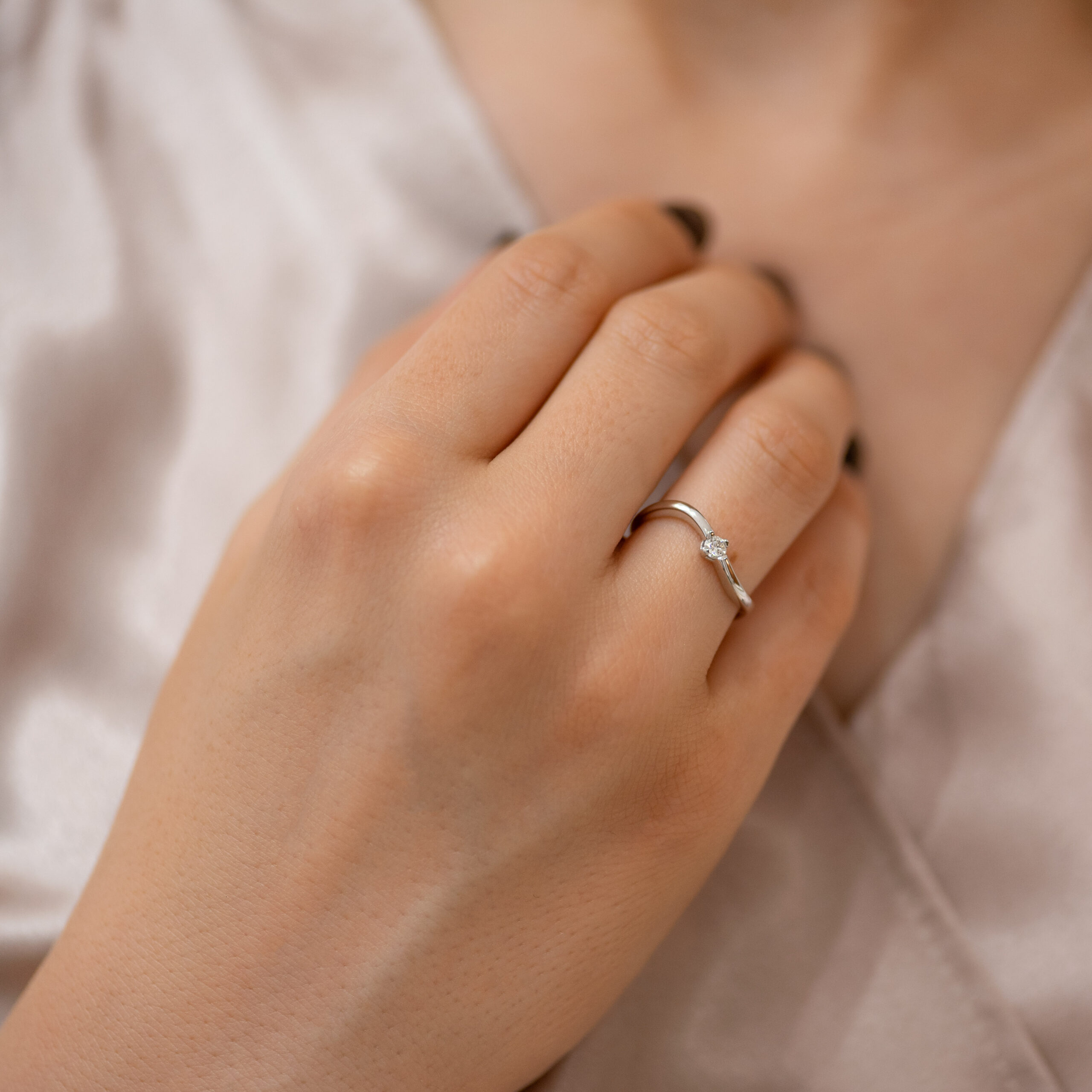 Zlatan prsten malo drugačijeg, nepravilnog oblika. Pored jedinstvenosti dizajna, istaći će se i prelepim dijamantom, postavljenim u ravni šine. Sam prsten može biti napravljen od belog, roze ili žutog zlata, finoće 14k.