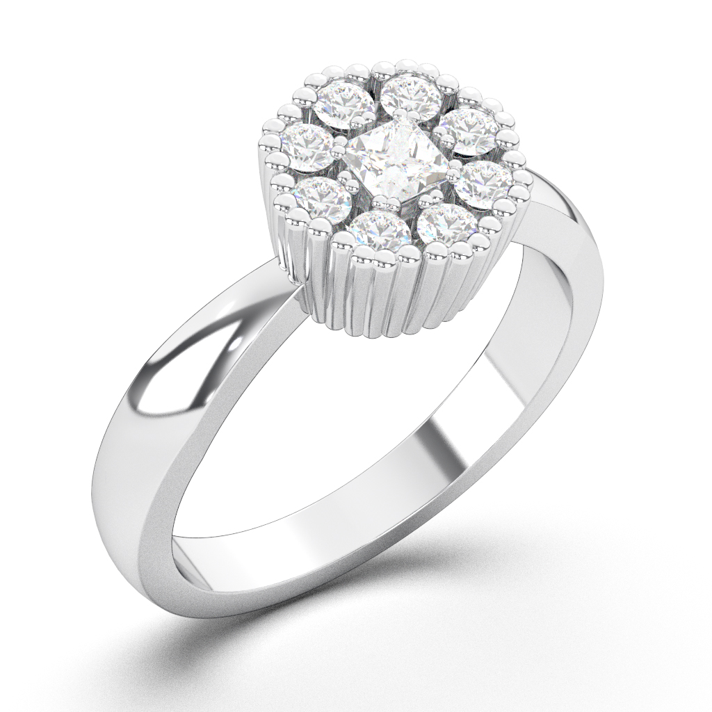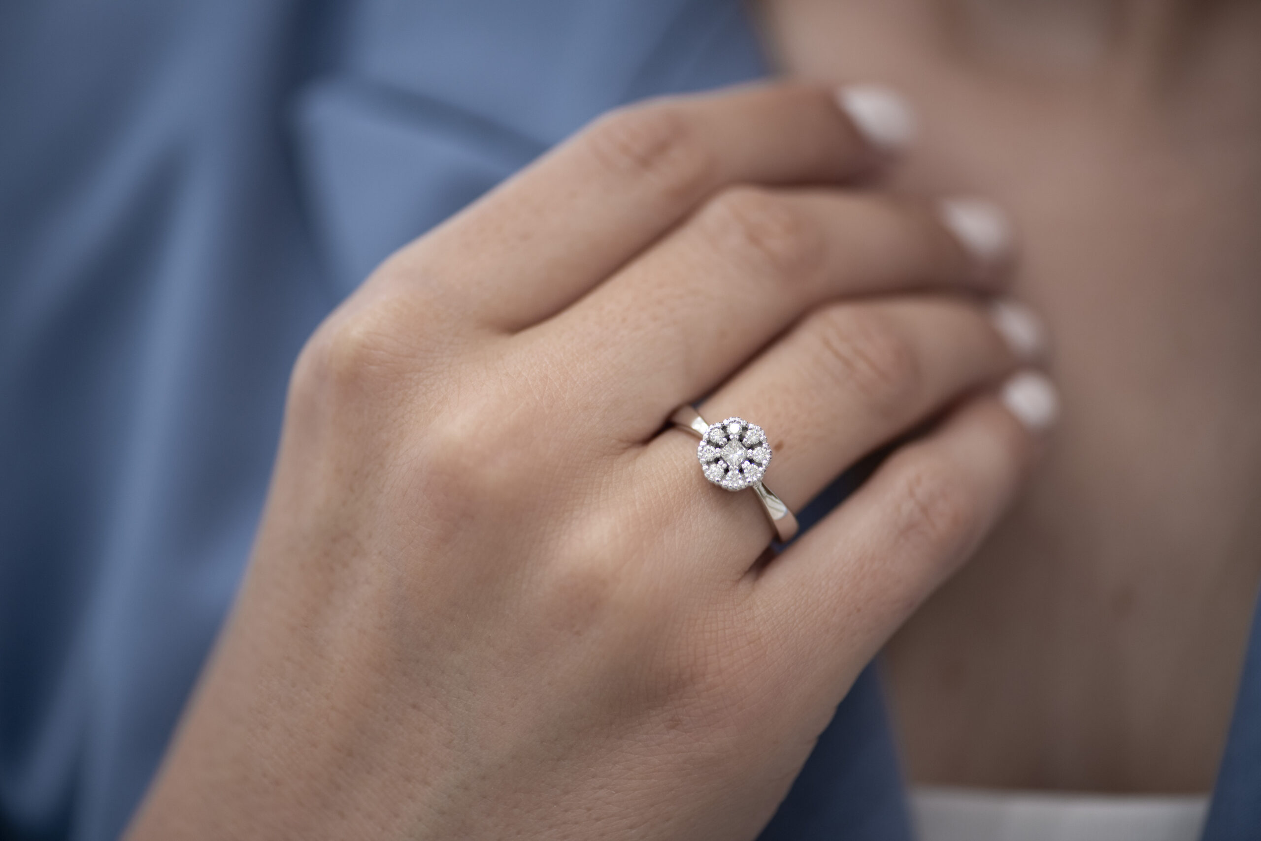Dijamantski prsten od belog zlata, sa moćnom krunicom i nizom dijamanata povezanih u ciklični red, oblika cveta. Sam prsten može biti napravljen od belog, roze ili žutog zlata, finoće 14k ili 18k. U zlatari Andrejević Vam nudimo mogućnost da birate veličinu i sve ostale karakteristike dijamanta kako biste bili sigurni da će krajnji rezultat biti upravo dijamantski prsten kakav ste želeli.