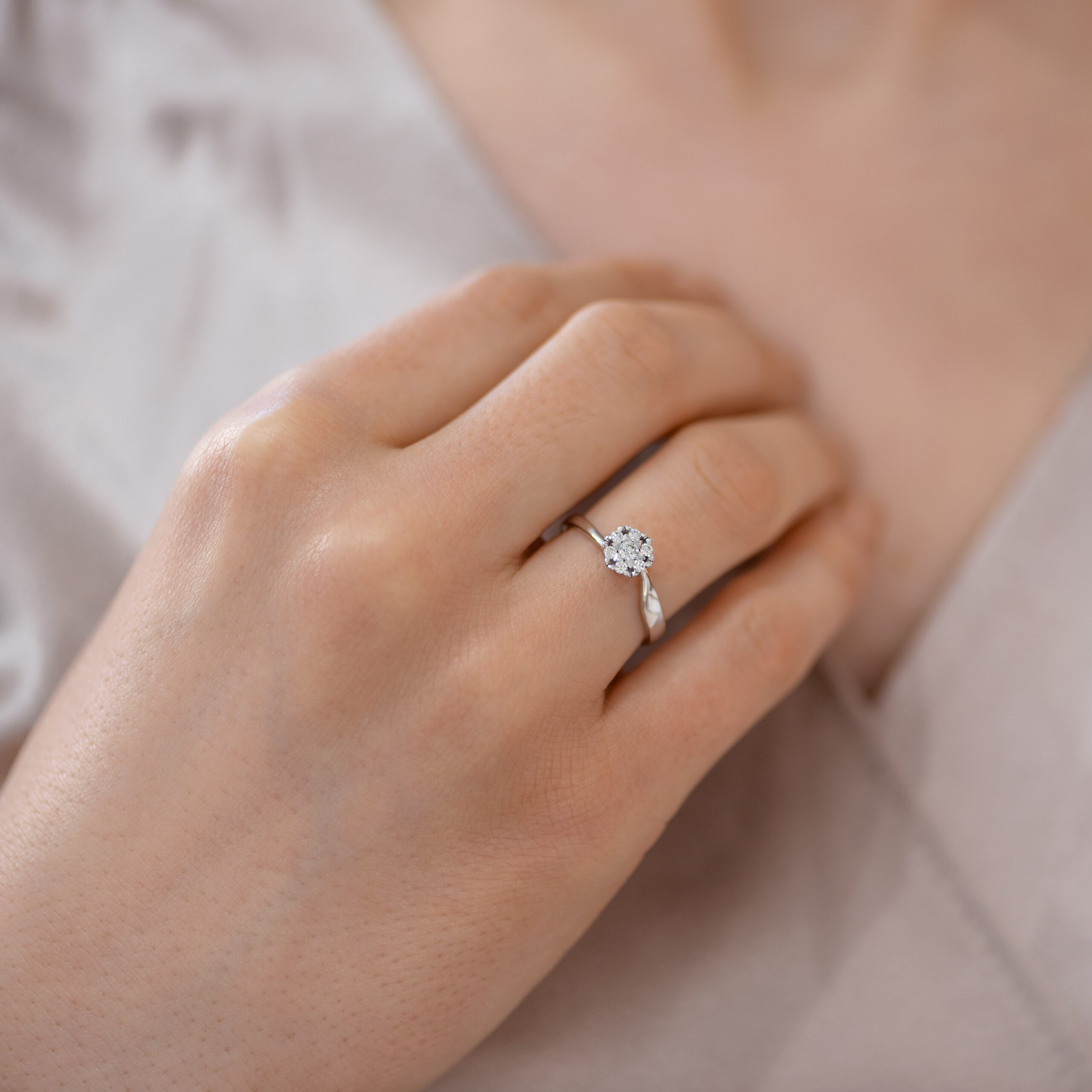 Verenički prsten zanimljivog i domišljatog dizajna. Dijamanti vrhunskih karakteristika su vešto postavljeni tako da stvaraju iluziju da se radi o jednom velikom kamenu. Ovakav prsten se zbog toga zove Illusion setting engagement ring.