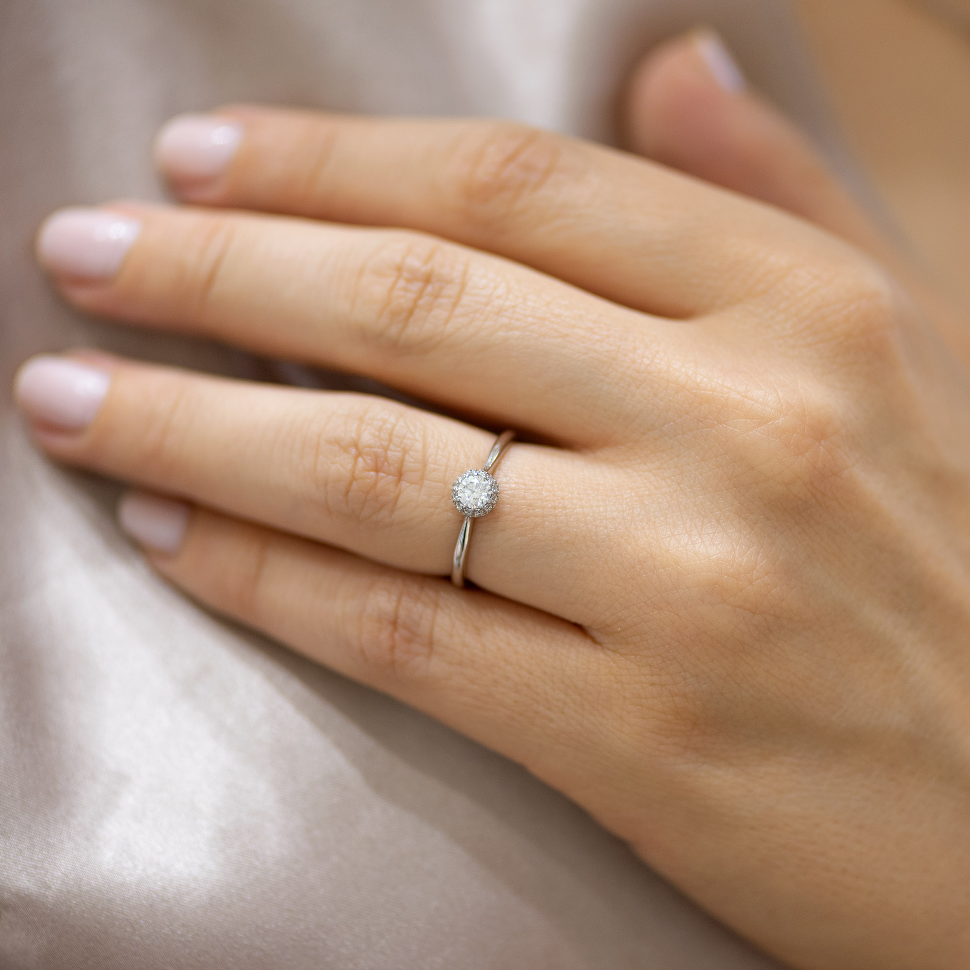 Verenički prsten sa mnoštvom dijamanata je za one gospođice, buduće gospođe, koje vole klasiku, ali i upadljivost. Ravnoteža je uspostavljena iskusnim kombinovanjem detalja. Njih čine blaga udubljenja na spoljnoj površini kružnice prstena, odakle se na centralnom delu odvažno sijaju dijamanti. Dominantan po veličini je kružni dijamant, kog obavija 12 manjih. Zajedničko svima njima je visok kvalitet i sjaj koji ostavlja snažan utisak.
