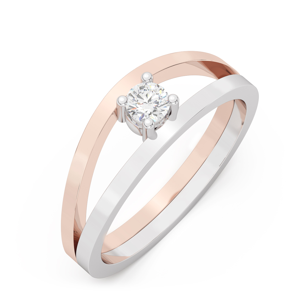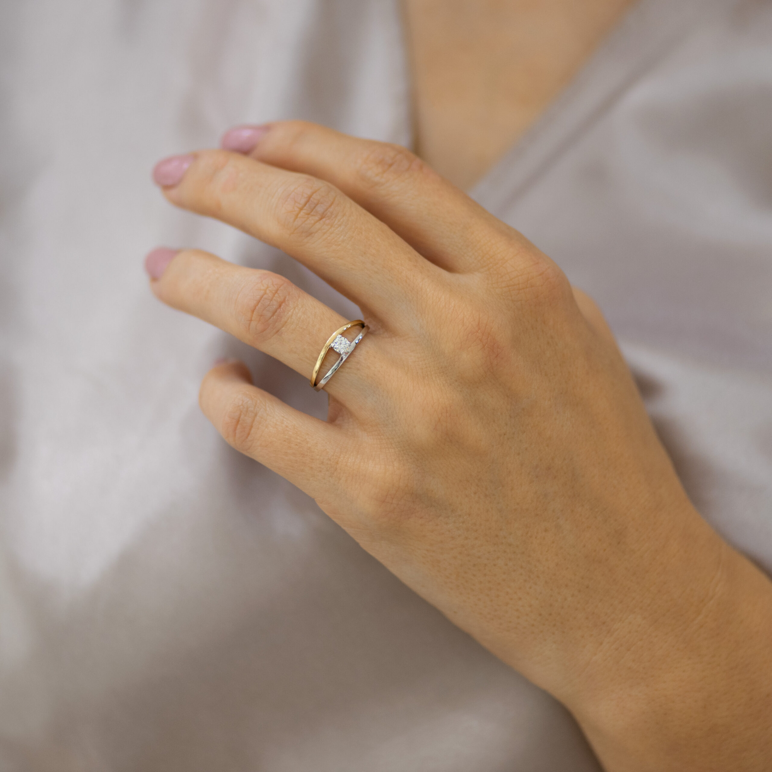 Prsten koji izgleda kao da su dva prstena različitih boja zlata spojena, a u jednom delu razdvojena tek toliko da u međuprostor uđe dijamant. Zanimljiv prsten koji ne može ostati neprimećen.