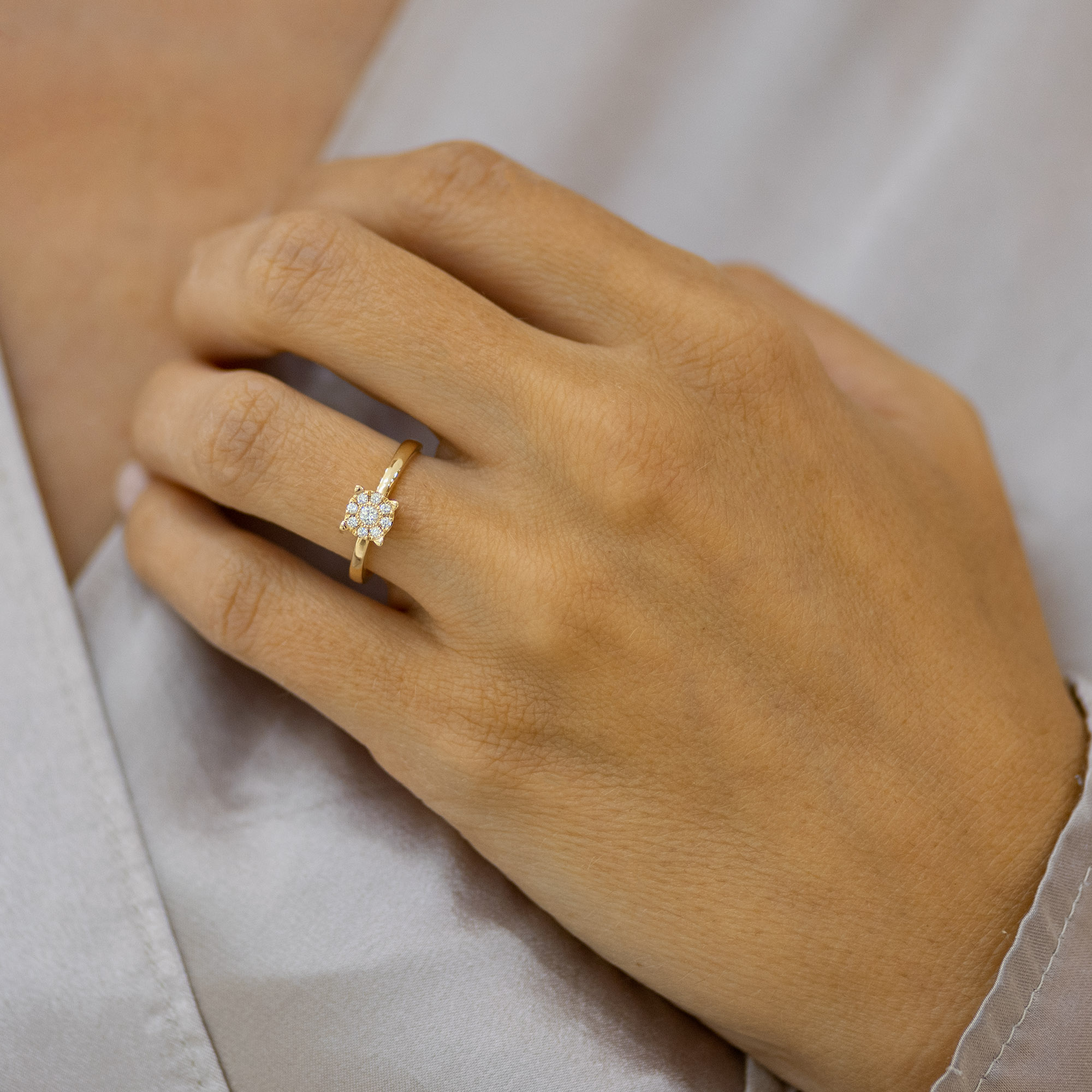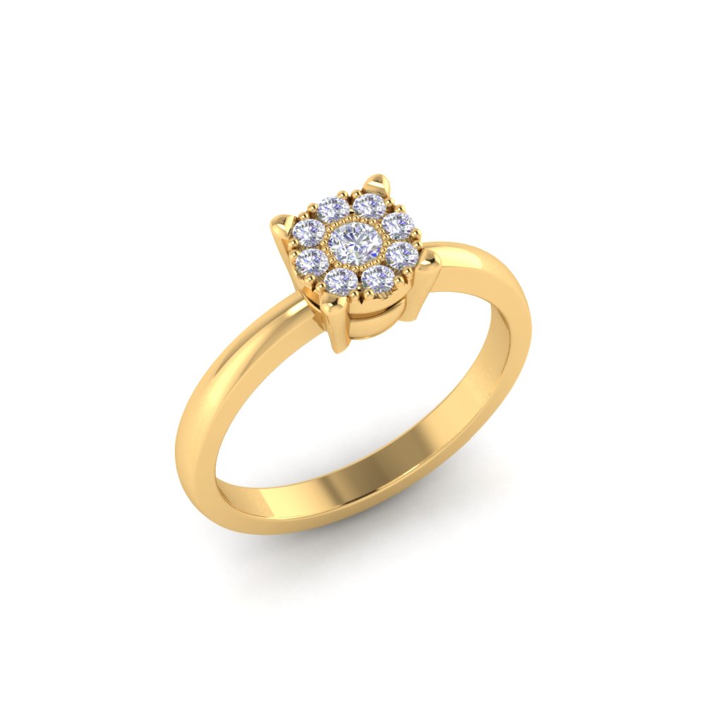 Prsten krasi čak devet dijamanata grupisanih tako da čine krug koji je fiksiran sa četiri držača. Centralni dijamant je malo veće karataže i okružen je manjim držačima koji prave pun krug, dajući kamenu poseban sjaj. Sam prsten može biti napravljen od belog, roze ili žutog zlata, finoće 14k ili 18k. U zlatari Andrejević Vam nudimo mogućnost da birate veličinu i sve ostale karakteristike dijamanta kako biste bili sigurni da će krajnji rezultat biti upravo dijamantski prsten kakav ste želeli.