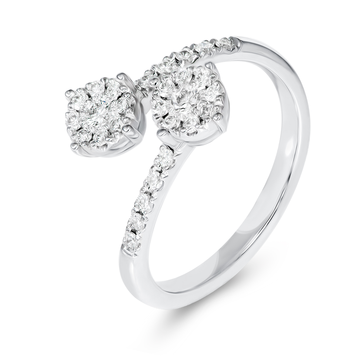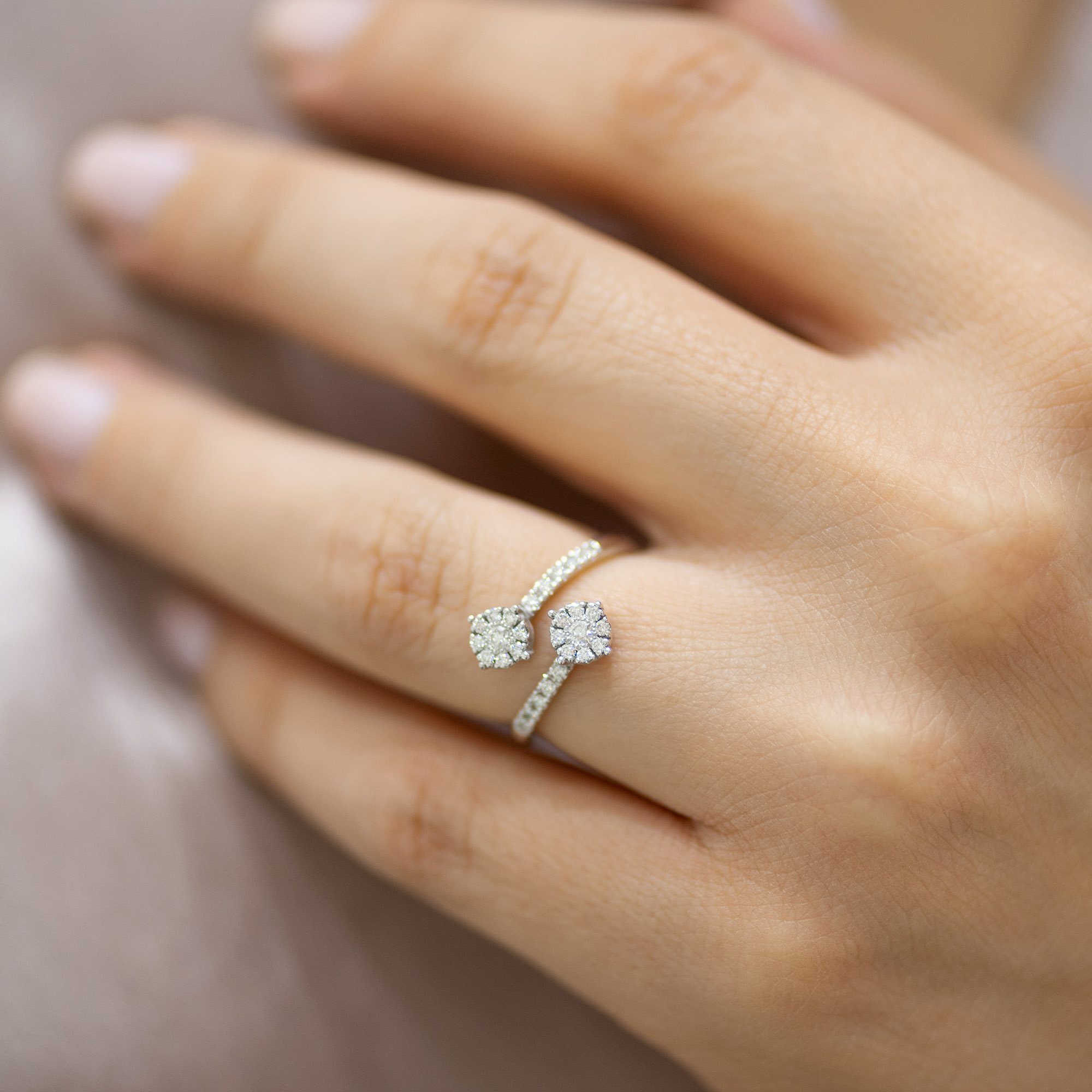 Dijamantski prsten neobičnog i dizajna i raskošnog sjaja. Napravljen od 14-karatnog zlata i ukrašen sa čak 28 brilijanata, ovaj dijamantski prsten privući će pažnju u svakoj prilici. Kružnica prstena je prekinuta i jedan krak ide iznad drugog. Kraci nisu tipični – na njima se nalaze dijamanti grupisani u dva grozda, a iza svakog grozda nalazi se po 5 manjih brilijanata koji su ufasovanih u samu kružnicu ptstena. U zlatari Andrejević, nudimo Vam mogućnost da sami izaberete karatažu, čistoću i boju dijamanta, kao i boju zlata, kako biste bili sigurni da će krajnji rezultat biti upravo dijamantski prsten kakav ste želeli.