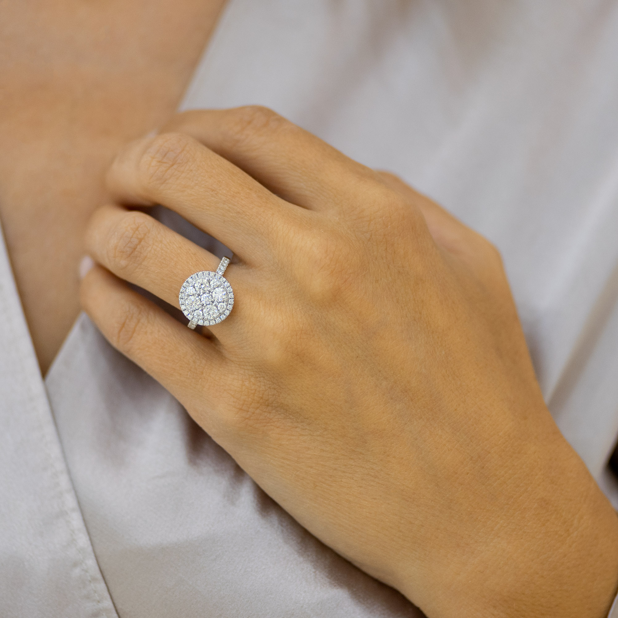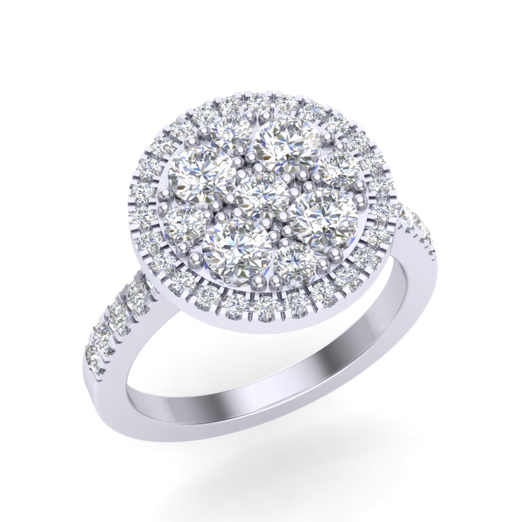 Dijamantski prsten nesvakidašnjeg dizajna ukrašen sa čak 45 brilijanata. Kružnica prstena ima oštre ivice i na njoj se nalazi 10 malih brilijanata usađenih u vertikalne ureze, bez standardnih držača. Centralni klaster dijamanata sastoji se od dva kruga gde spoljašnji ima 26 manjih dijamanta koji su ufasetirani na isti način kao kamenje na kružnici prstena. Unutrašnji krug ima devet većih brilijanata, a svaki od njih ima po četiri držača oblo brušenih vrhova. Sam prsten može biti napravljen od belog, roze ili žutog zlata, finoće 14k ili 18k. U zlatari Andrejević Vam nudimo mogućnost da birate veličinu i sve ostale karakteristike dijamanta kako biste bili sigurni da će krajnji rezultat biti upravo dijamantski prsten kakav ste želeli.