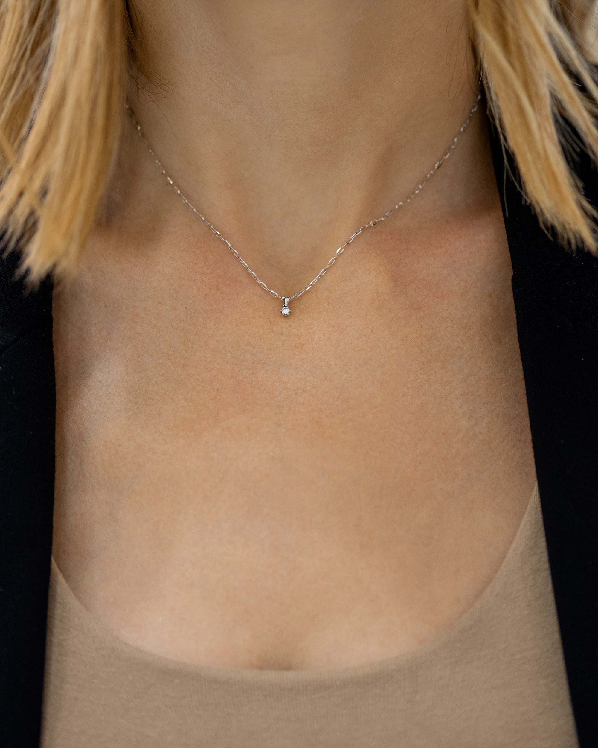 Privezak od zlata sa jednim dijamantom brilijantskog reza. Brilijant ima šest okruglih držača i postavljen je na diskretnu zlatnu osnovu. Iako kroz klasičnu alku može da prođe i lanac srednje debljine, naša prepouka je da se nosi na tanjem lančiću zbog svoje veličine i delikatnog dizajna. Zlatni privesci zlatare Andrejević mogu biti izrađeni u bilo kojoj od 3 boje zlata: beloj, roze, ili žutoj. Uz to, u zlatari Andrejević, nudimo Vam mogućnost da sami izaberete karatažu, čistoću i boju dijamanta kako biste bili sigurni da će privesci biti upravo onakvi kakve ste želeli.