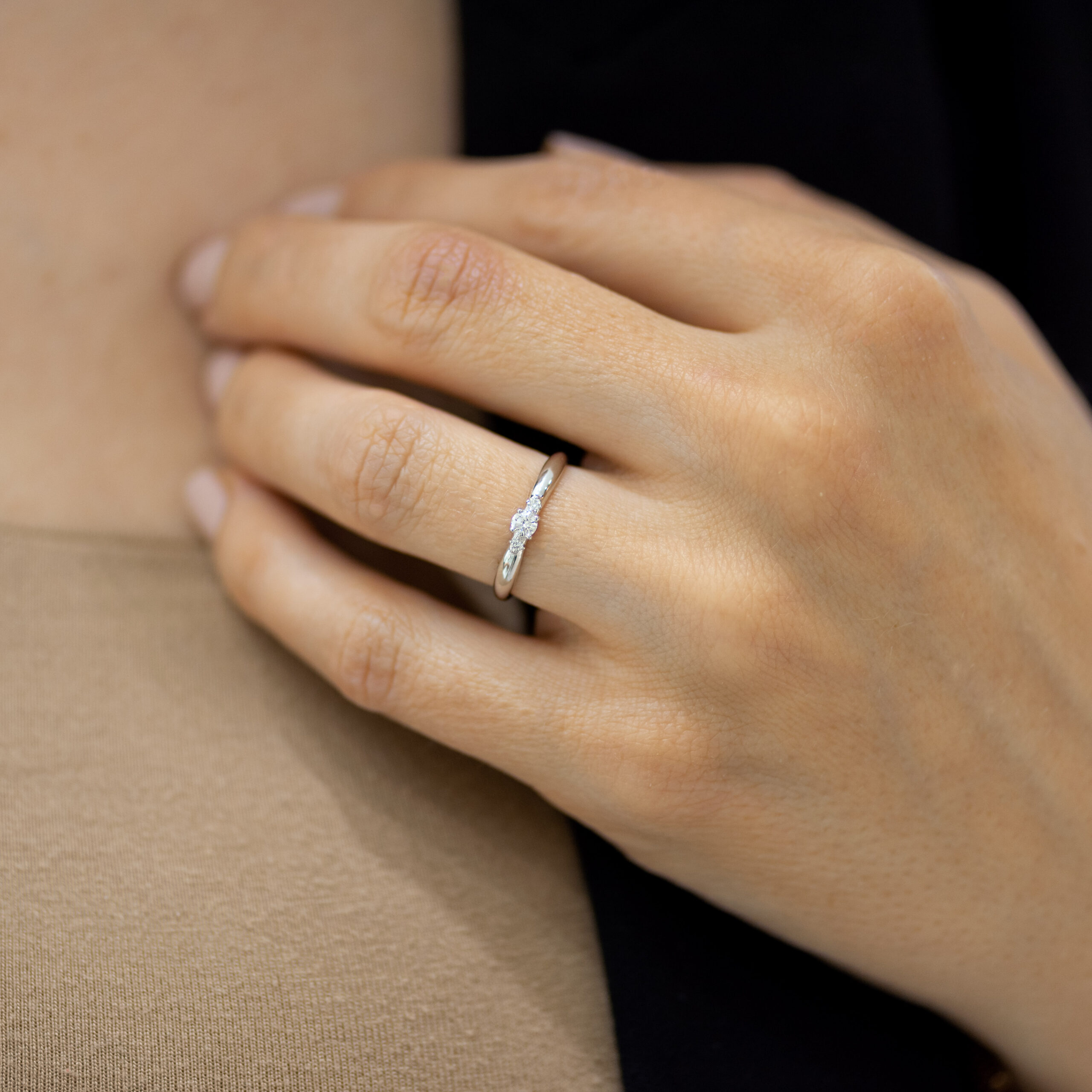 Verenički prsten svedenog dizajna, ukrašen sa tri manja dijamanta, jednim većim u sredini i po jednim sa svake strane. Veći kamen je osiguran sa četiri držača zaobljenih ivica, dok manje kamenje ima stilizovane držače koji nalikuju laticama cveta. Sam prsten može biti napravljen od belog, roze ili žutog zlata, finoće 14k ili 18k.