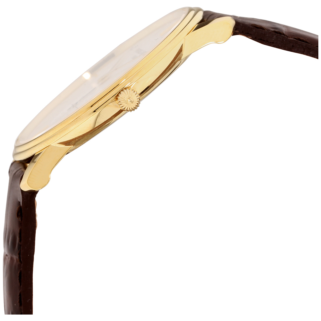 Elegantan muški sat ima kućište od nerđajućeg čelika pozlaćena žutom bojom i kožnim kaišem tamno braon boje.