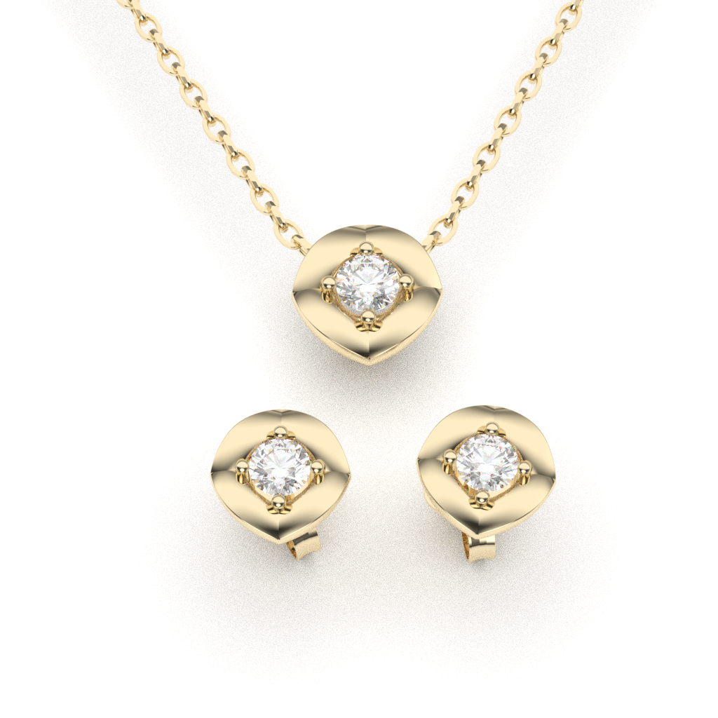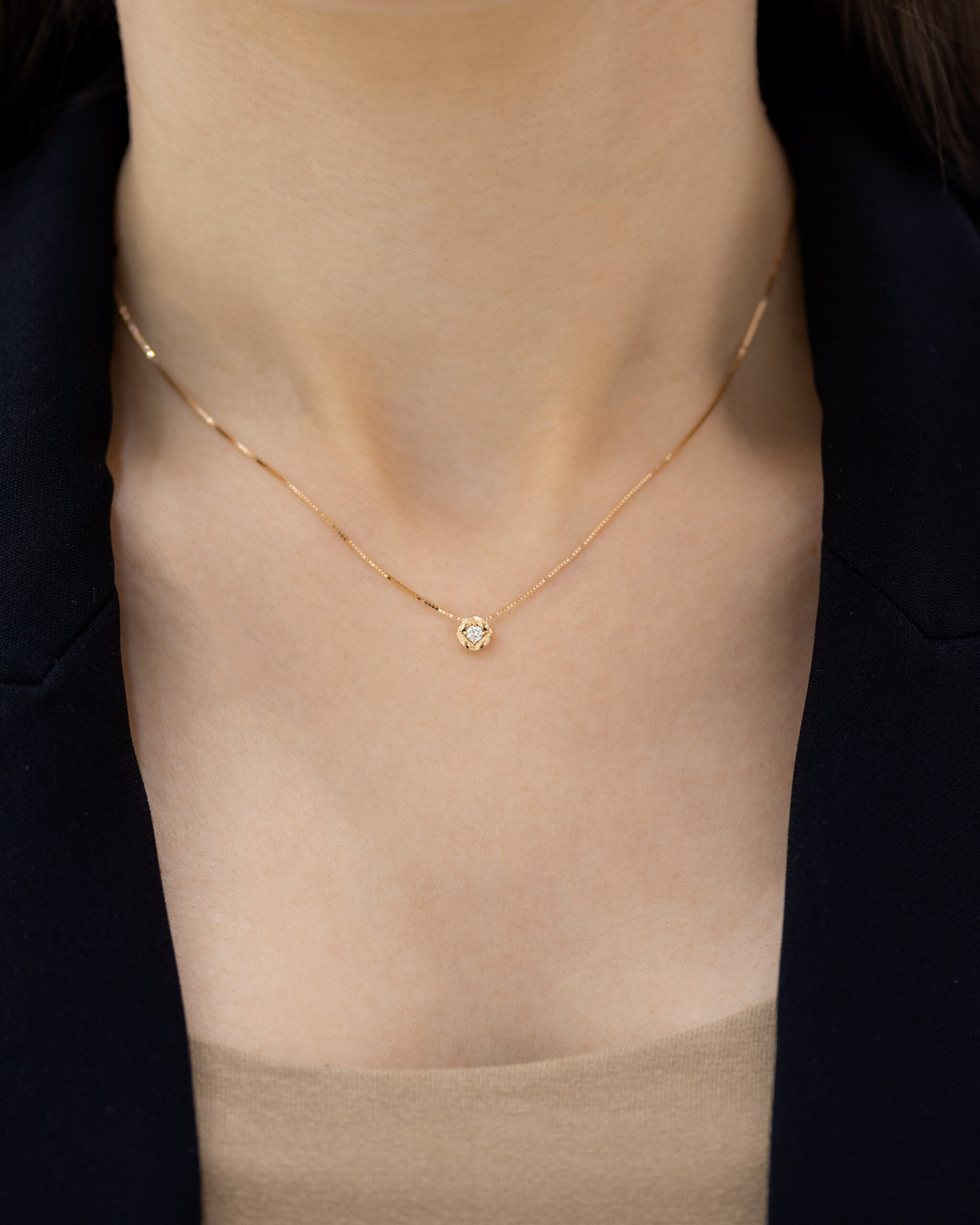 Privezak od zlata u obliku kruga koji krasi jedan jedini dijamant brilijantskog reza, postavljen u samu sredinu. Privezak je izrađen od najkvalitetnijeg 14-karatnog zlata izuzetnog sjaja i nema klasičnu alku. Umesto toga, lančić prolazi sa zadnje strane priveska, čineći ga tako lepše istaknutim na vratu. Krug je sačinjen od četiri dela koji imaju blage talase i koji se savršeno stapaju jedan u drugi. Dijamant u sredini ima četiri obla držača ravno brušenih vrhova. Zlatni privesci zlatare Andrejević mogu biti izrađeni u bilo kojoj od 3 boje zlata: beloj, roze, ili žutoj, a kombinaciju boja zlata možete sami da odaberete. Uz to, u zlatari Andrejević, nudimo Vam mogućnost da sami izaberete karatažu, čistoću i boju dijamanta kako biste bili sigurni da će privesci biti upravo onakvi kakve ste želeli.