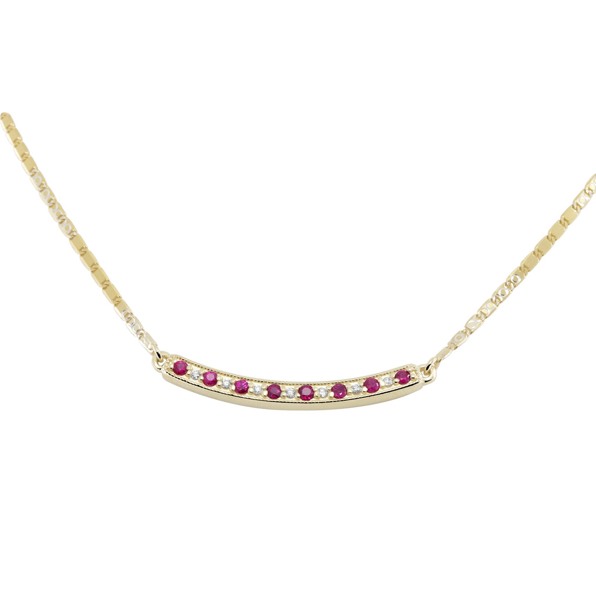 Zlatni privezak koji se gotovo u potpunosti stapa sa ogrlicom. Privezak je diskretan i elegantan, širok a tanak, i ukrašen je sa osam rubina i sedam brilijanata. Umesto klasične alke, privezak je pričvršćen za ogrlicu sa leve i desne strane, što ga čini savršeno stabilnim. Drago kamenje ima po četiri držača, dok je po ivici priveska diskretan rad od zlatnih kuglica. Privezak je izrađen od 14-karatnog zlata izuzetnog sjaja i kvaliteta. Zlatni privesci zlatare Andrejević mogu biti izrađeni u bilo kojoj od 3 boje zlata: beloj, roze, ili žutoj. Uz to, u zlatari Andrejević, nudimo Vam mogućnost da sami izaberete karatažu, čistoću i boju dijamanta kako biste bili sigurni da će privesci biti upravo onakvi kakve ste želeli.