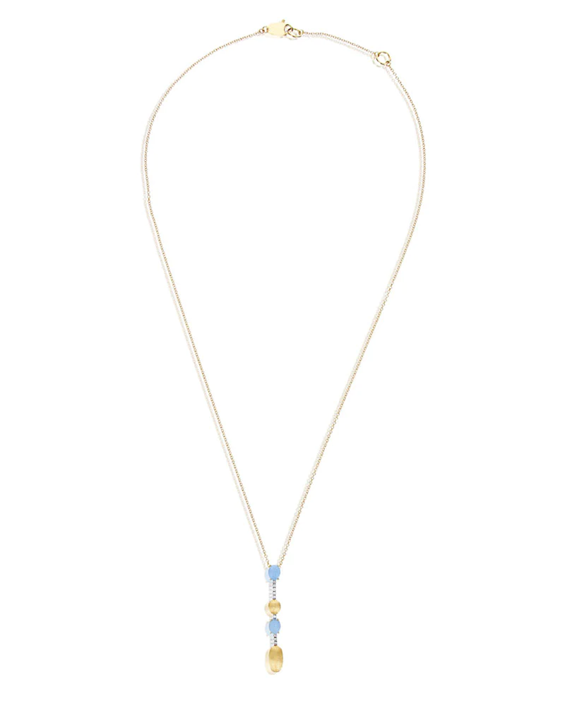 Nanis ogrlica od žutog zlata jedinstvena je zahvaljujući privescima koji padaju sa klasičnog lanca. Privezaka je ukupno četiri. To su dva zlatna, ovalna priveska, čija površina je obrađena ručno, i dva priveska od takozvanog mlečnog akvamarina. Nežna svetloplava boja poludragog kamena savršeno se uklapa uz boju 18- karatnog zlata, a ne sme se zaboraviti ni sjaj dijamanata koji suptilno ,,spajaju” priveske. Zlatna ogrlica pripada kolekciji Azure, italijanskog brenda nakita Nanis.