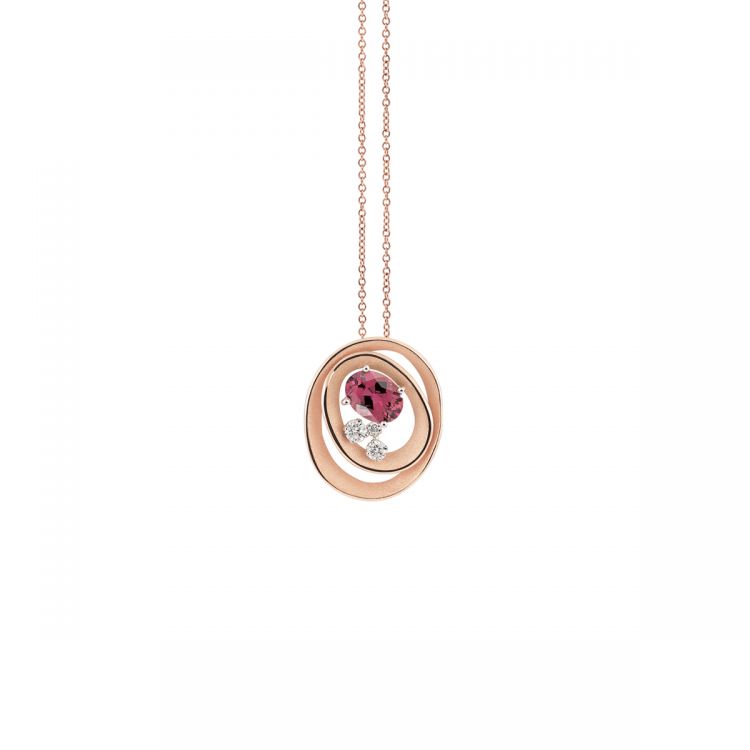 Zlatna ogrlica sa dijamantom koja dolazi iz Annamaria Cammilli radionice. Izrađena je od najkvalitetnijeg 18K roze zlata jedinstvene mat završnice a krasi je neobičan privezak na delikatnom zlatnom lančiću. Jedinstvenog je oblika nalik na oval i krug vijugavih ivica po kojima su posuti dijamanti kao i jedan impresivni turmalin. Neodoljivo podseća na godove drveta na kojima blistaju kapljice vode.