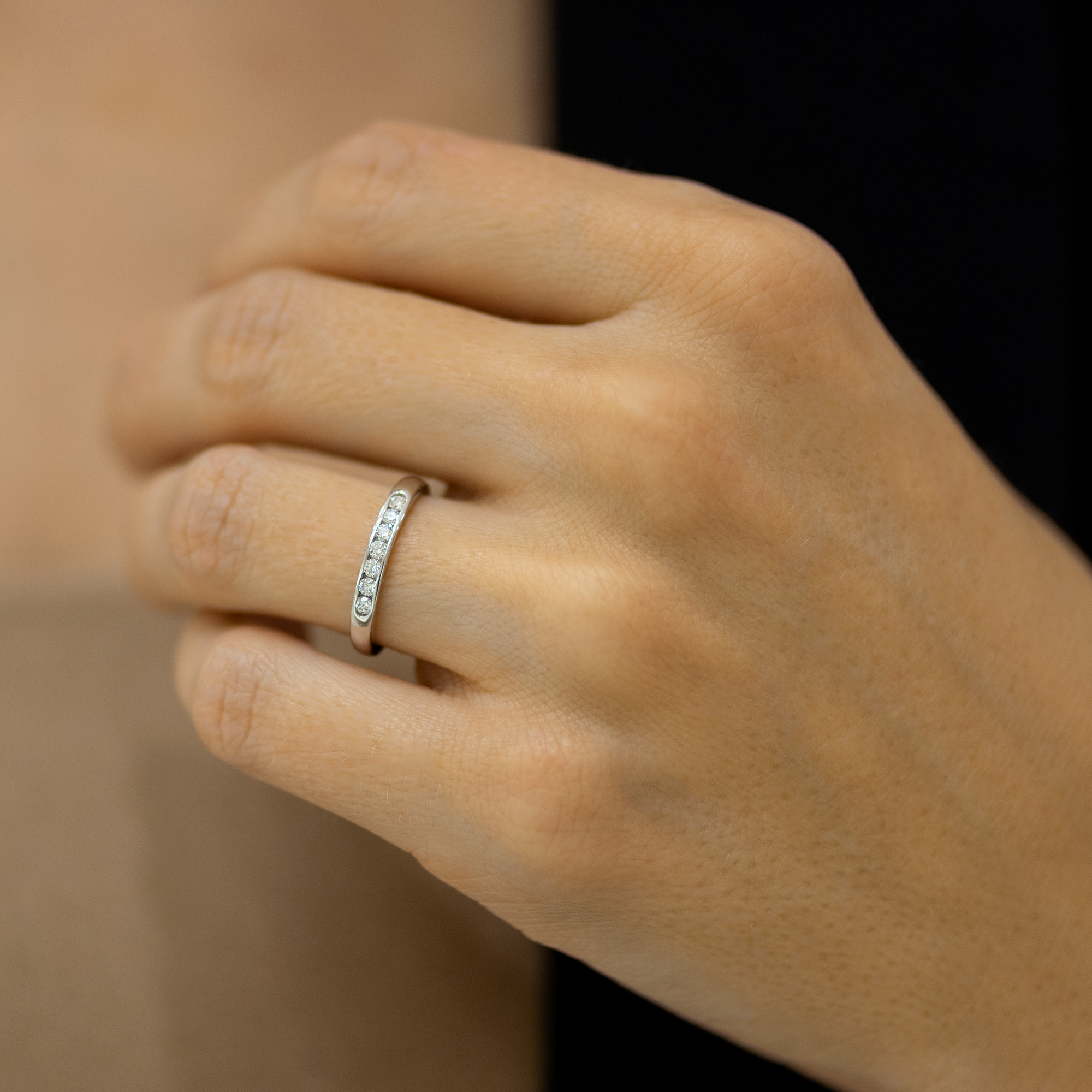 Ukupno sedam malih, odlično obrađenih dijamanata utisnuto je u glatku površinu prstena.