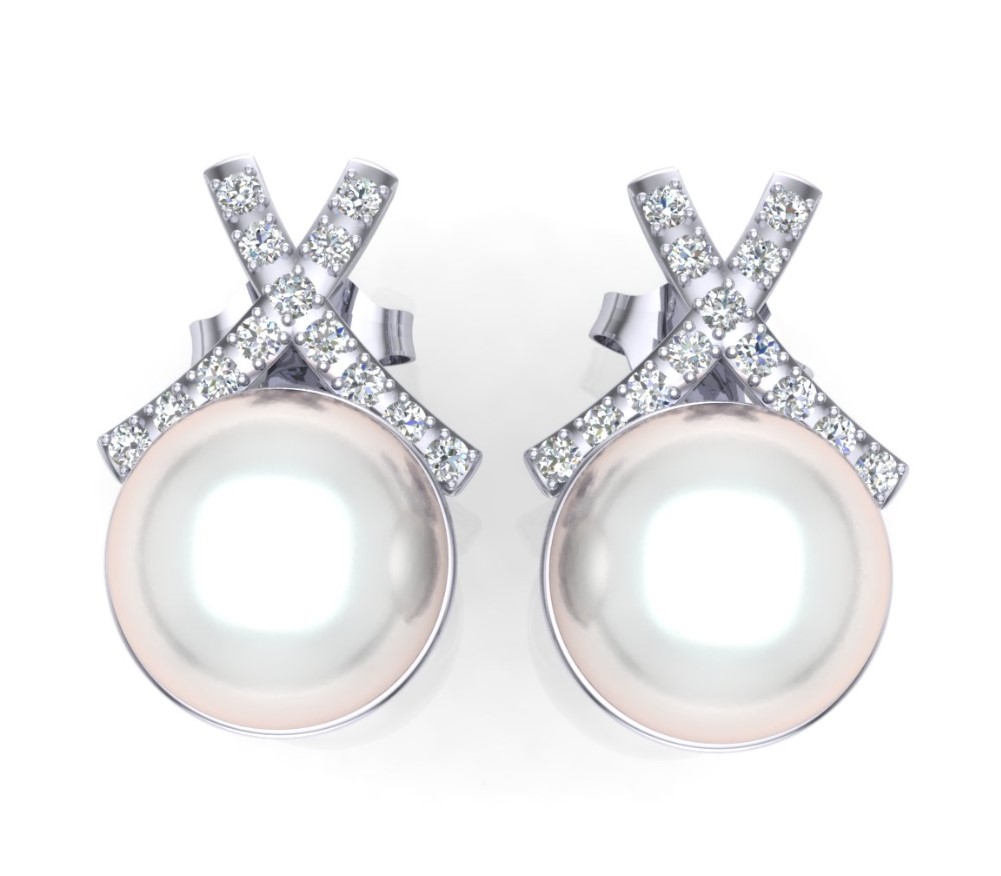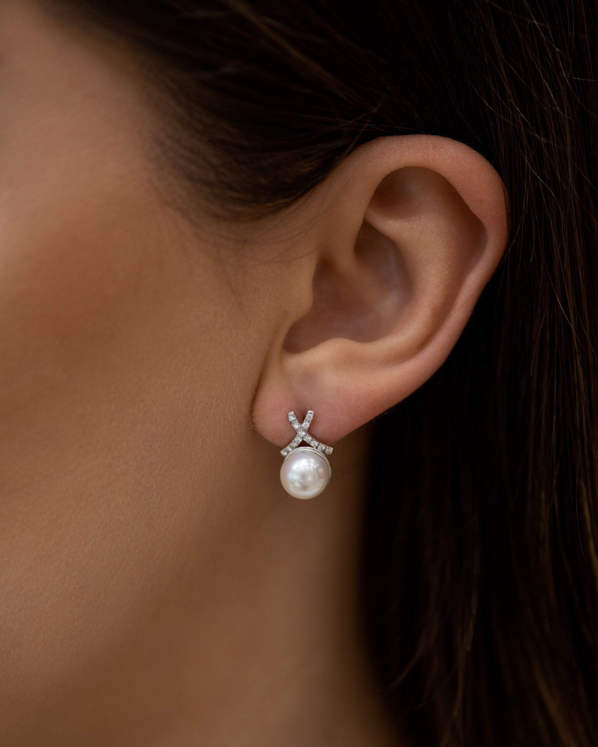 Biserne minđuše od zlata, ukrašene dijamantima. Ove minđuše su jednostavne, biser je postavljen u diskretnu zlatnu osnovu, kopčaju se na klasični šraf, a igla je skrivena iza lepog ukrasa od dijamanata u obliku slova X. U zlatari Andrejević, nudimo Vam mogućnost da sami izaberete karatažu, čistoću i boju dijamanata, kao i boju zlata, kako biste bili sigurni da će krajnji rezultat biti upravo minđuše kakve ste želeli.