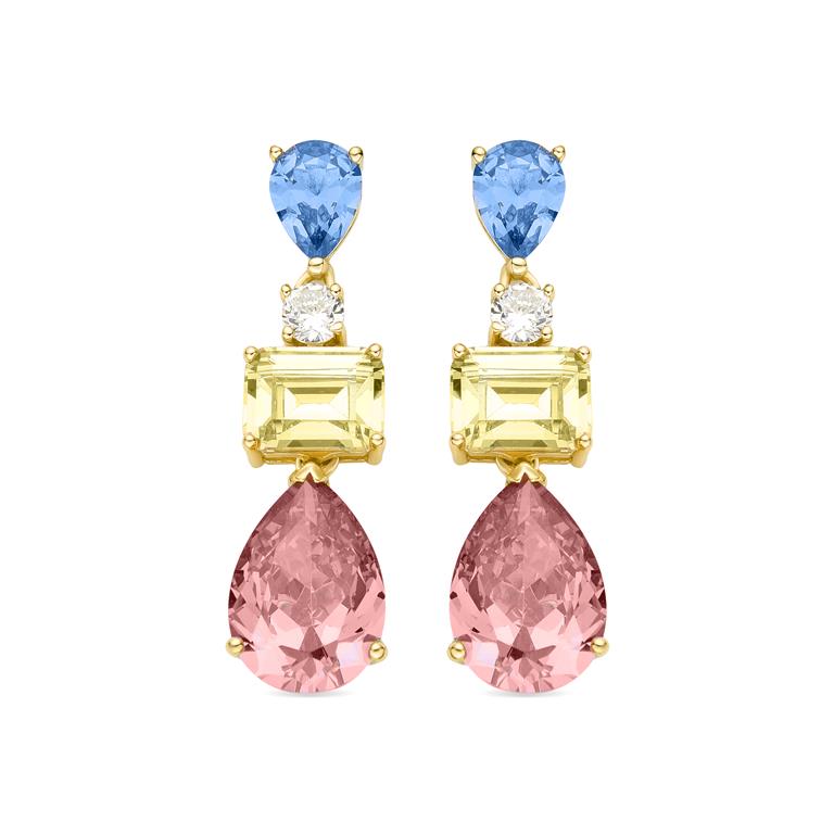 Luxenter srebrne minđuše sa raznobojnim kristalima različitih oblika. Kod iglice se nalazi plavi kristal kruškastog oblika, na njega je nakačen klasični okrugli cirkon i bledo žuti četvrtasti kristal, a na samom kraju nalazi se veći pepeljasto roze kruškasti kristal.