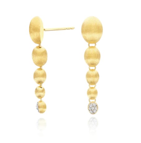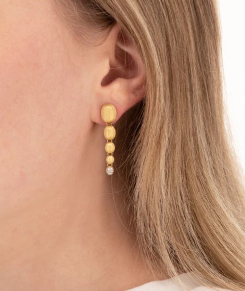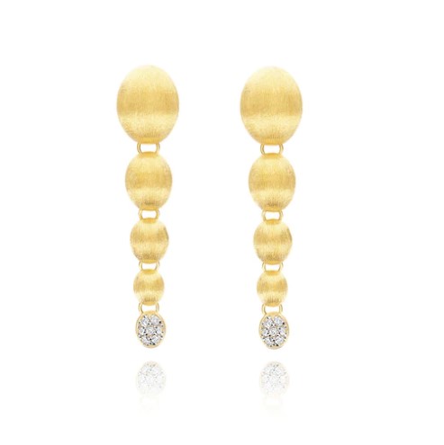 Viseće minđuše italijanskog brenda Nanis napravljene su od 18- karatnog žutog zlata i ukrašene su dijamantima. Zlato je oblikovano u kuglice manjih i većih dimenzija sa gravurom na površini koja je ručno urađena. Poslednja kuglica u nizu je i najmanja i u nju su utisnuti dijamanti velike prozirnosti.