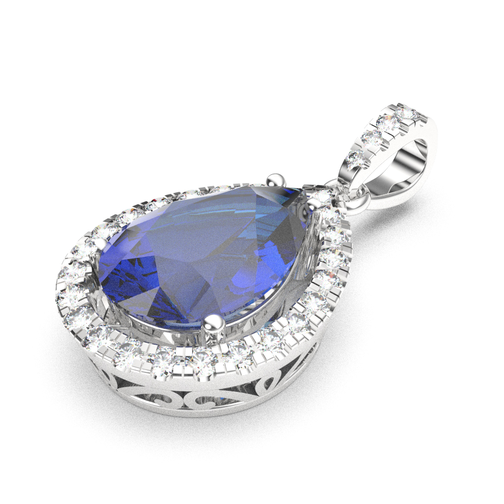 Privezak od zlata u obliku suze koji krase blistavi safir i brilijanti. Centralni kamen je zagasito plavi safir kurškastog (pear) reza, dok ga okružuju 24 blistava brilijanta smeštena u raskošno izrezbarenu zlatnu osnovu. Privezak je izrađen od najkvalitetnijeg zlata i ima klasičnu alku za lančić. Zlatni privesci zlatare Andrejević mogu biti izrađeni u bilo kojoj od 3 boje zlata: beloj, roze, ili žutoj. Uz to, u zlatari Andrejević, nudimo Vam mogućnost da sami izaberete karatažu, čistoću i boju dijamanata i drugog dragog kamenja kako biste bili sigurni da će privesci biti upravo onakvi kakve ste želeli.