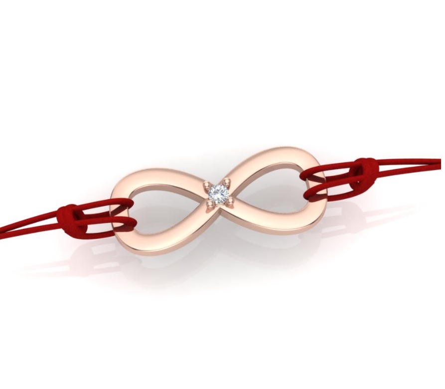 Narukvica od konca sa zlatnim priveskom koji predstavlja simbol beskonačnosti. Privezak je ukrašen blistavim dijamantom koji se nalazi na samoj sredini. Ova narukvica nema klasičnu kopču, već se njena veličina prilagođava ruci osobe koja je nosi. Narukvice zlatare Andrejević mogu biti izrađene u bilo kojoj od 3 boje zlata: beloj, roze, ili žutoj. Uz to, u zlatari Andrejević, nudimo Vam mogućnost da sami izaberete karatažu, čistoću i boju dijamanta kamenja kako biste bili sigurni da će narukvice biti upravo onakvi kakve ste želeli.