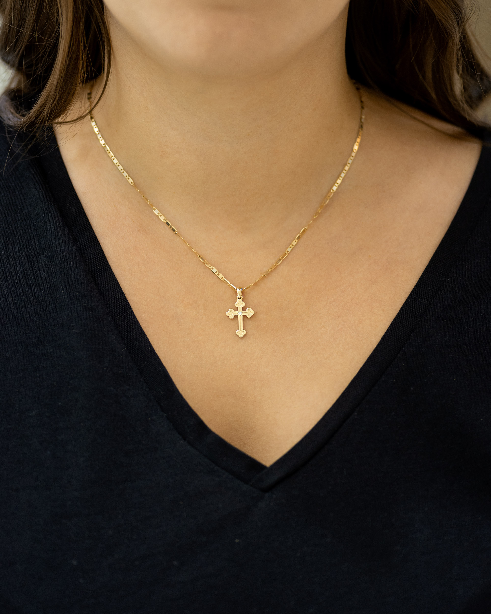 Privezak u obliku pravoslavnog krsta napravljen od najkvalitetnijeg zlata sa jednim dijamantom. Ovaj privezak je jednostavan i sveden, diskretno je ukrašen i ima klasičnu alku. Ivice krsta su izdignute, a u samom centru priveska nalazi se dijamant. Privesci u obliku krsta mogu da se nose oko vrata na lančiću ili oko ruke na narukvici. Zlatni privesci zlatare Andrejević mogu biti izrađeni u bilo kojoj od 3 boje zlata: beloj, roze, ili žutoj. Uz to, u zlatari Andrejević, nudimo Vam mogućnost da sami izaberete karatažu, čistoću i boju dijamanta i drugog dragog kamenja kako biste bili sigurni da će privesci biti upravo onakvi kakve ste želeli.