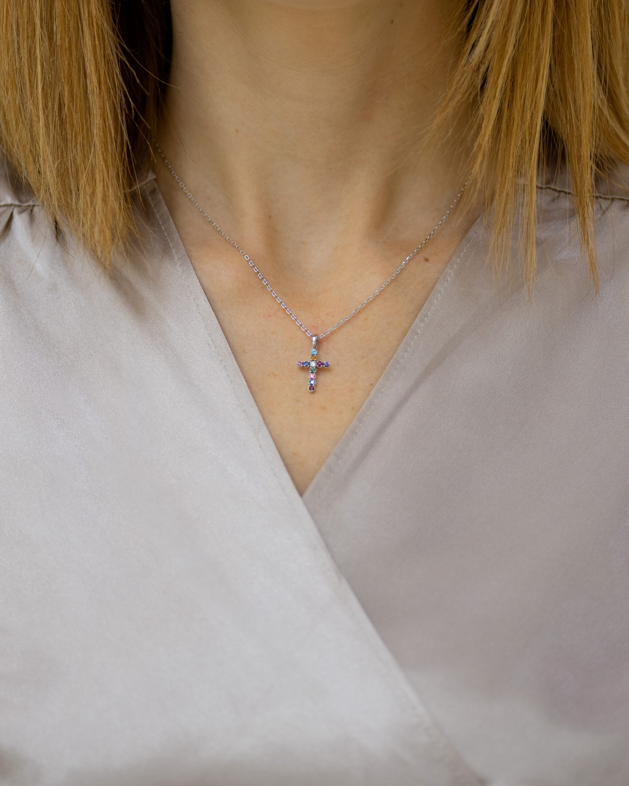 Privezak od zlata u obliku krsta koji krasi 11 raznobojnih dragulja. Izrađen je od zlata najvećeg kvaliteta i ima klasičnu alku, a na samoj sredini nalazi se jedan blistavi brilijant izuzetnog sjaja. Zlatni privesci zlatare Andrejević mogu biti izrađeni u bilo kojoj od 3 boje zlata: beloj, roze, ili žutoj. Uz to, u zlatari Andrejević, nudimo Vam mogućnost da sami izaberete karatažu, čistoću i boju dijamanta kako biste bili sigurni da će privesci biti upravo onakvi kakve ste želeli.