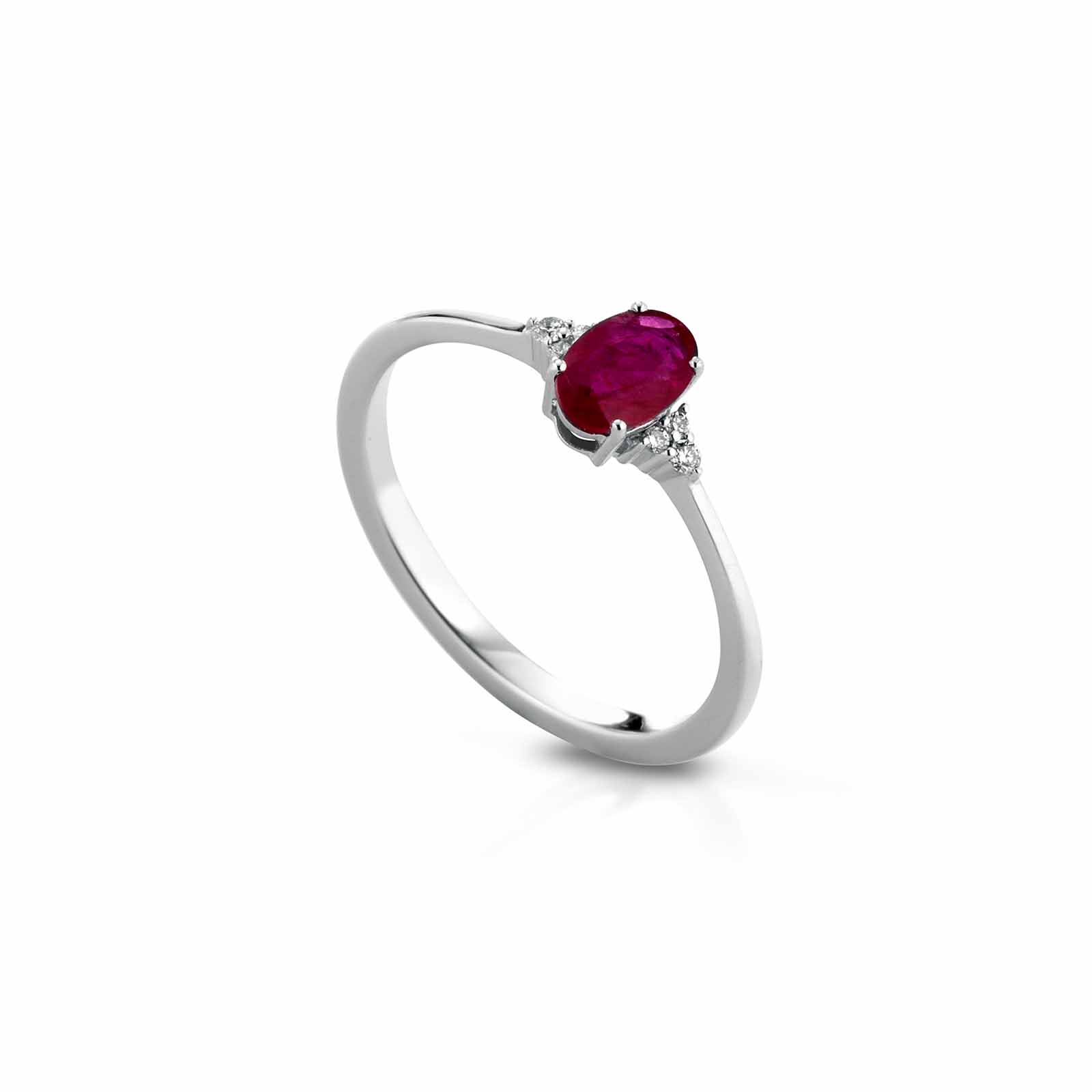 Elegantni prsten sa ovalnim rubinom u središtu i po jednim dijamantom sa svake strane. Kombinacija bogate crvene boje i nežnog dijamantskog sjaja daje klasičan, ali upečatljiv izgled. Savršen za posebne prilike ili kao svakodnevni znak sofisticiranog stila.