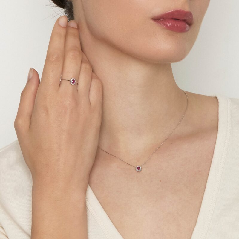 Privezak od zlata ovalnog oblika koji krasi 13 dragulja. Centralni kamen je rubin ovalnog reza, dok ga okružuje 12 blistavih brilijanata. Ogrlica je izrađena od 18k belog zlata .