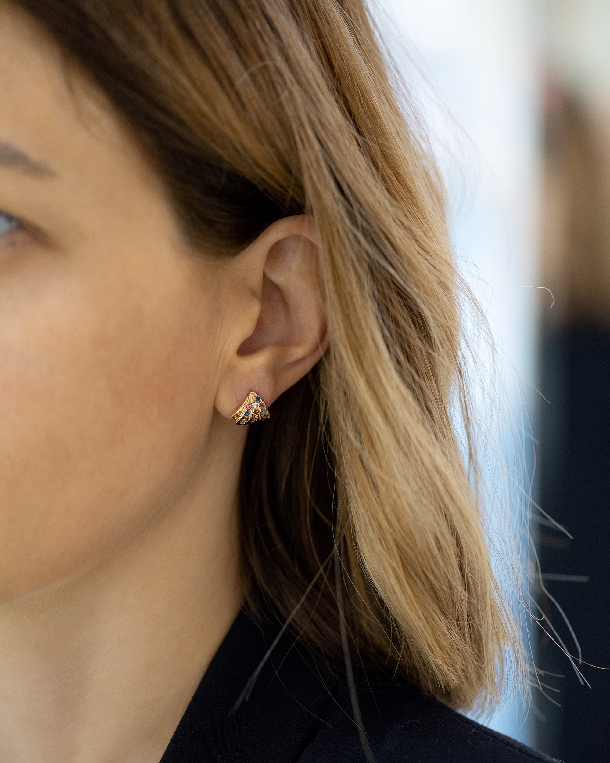 Minđuše od zlata u obliku školjki iz čuvene kolekcije Tutti Frutti, ukrašene raznobojnim dragim kamenjem. Ove zlatne minđuše su blago lepezastog oblika i pričvršćuju se klasičnim šrafićima. Šareni dragulji su posuti po čitavoj površini dok im zanimljivu teksturu daju i zlatni držači. U zlatari Andrejević, nudimo Vam mogućnost da sami izaberete boju zlata, kako biste bili sigurni da će krajnji rezultat biti upravo minđuše kakve ste želeli.