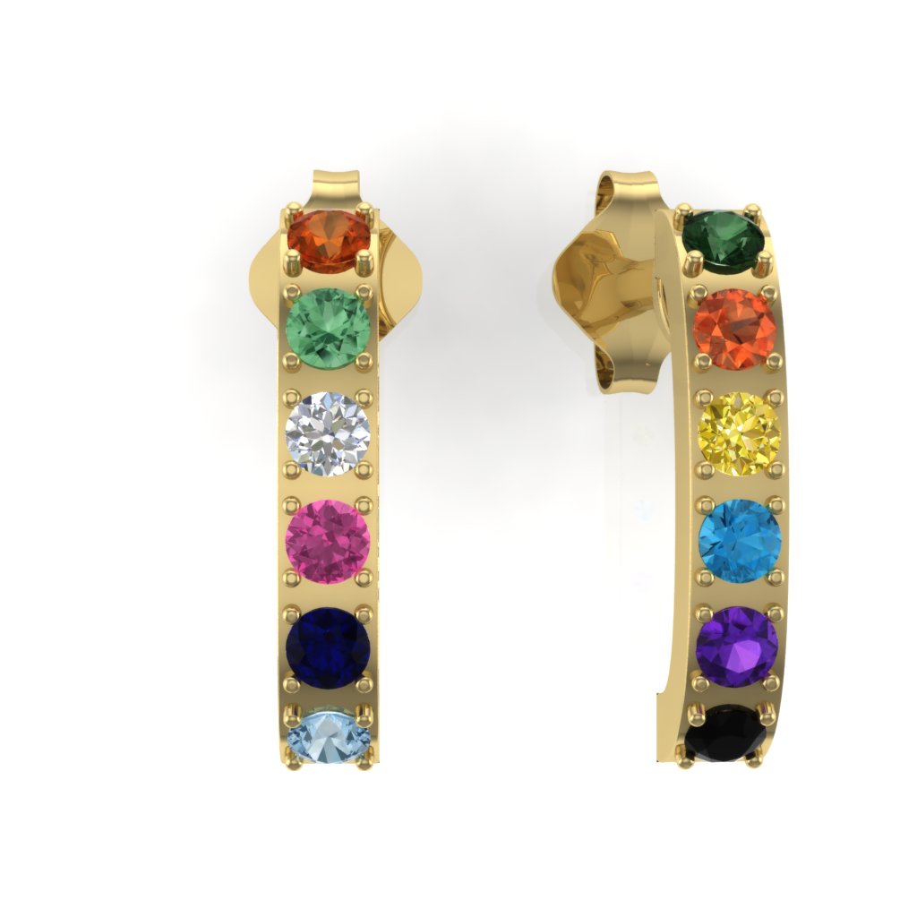 Minđuše iz kolekcije Tutti Frutti, otvorene alke manjih dimenzija i ukrašene dragim kamenjem. U svaku otvorenu alkicu ufasovano je po šest dragih kamenova različite boje, što ove zlatne minđuše čini posebno blistavim i raskošnim. U zlatari Andrejević, nudimo Vam mogućnost da sami izaberete karatažu, čistoću i boju dijamanata, kao i boju zlata, kako biste bili sigurni da će krajnji rezultat biti upravo minđuše kakve ste želeli.
