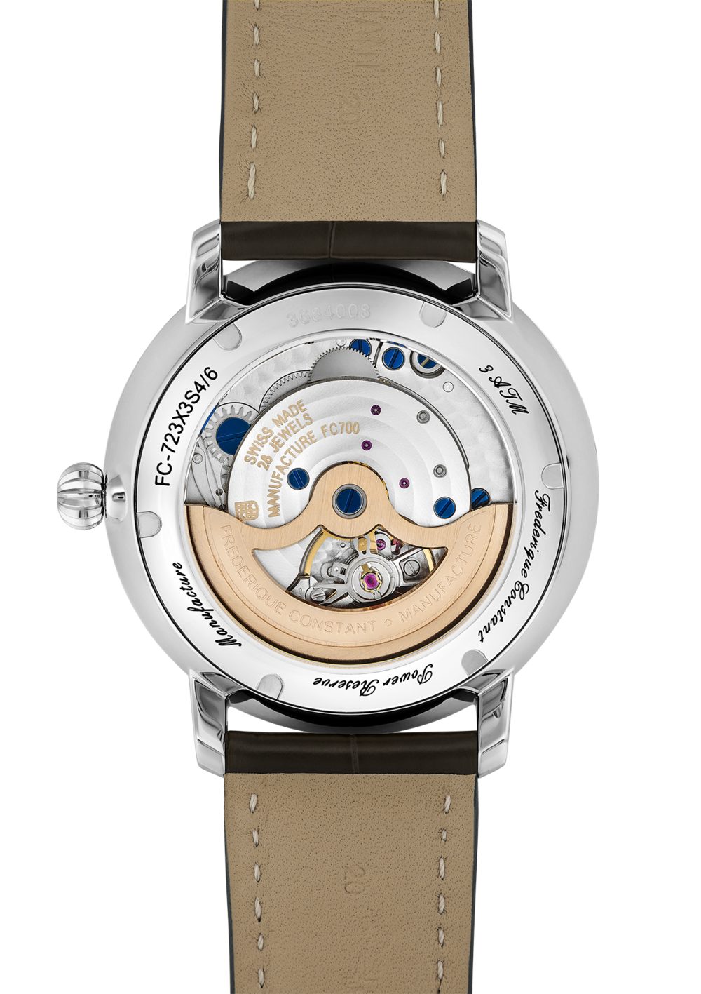 Kućište od nerđajućeg čelika sa teget aligator kožnom narukvicom. Ručno naneseni indeksi rimskih brojeva sa komplikacijom datuma i rezerve snage. Frederique Constant kalibar FC-723 automatskog mehanizma koji sadrži 28 dragulja i rezervu snage do 50 časova. Kućište prekriveno konveksnim, safirnim staklom. Veličina kućišta: 40mm.