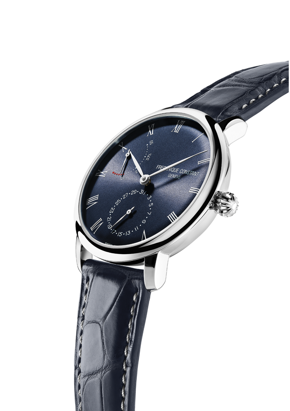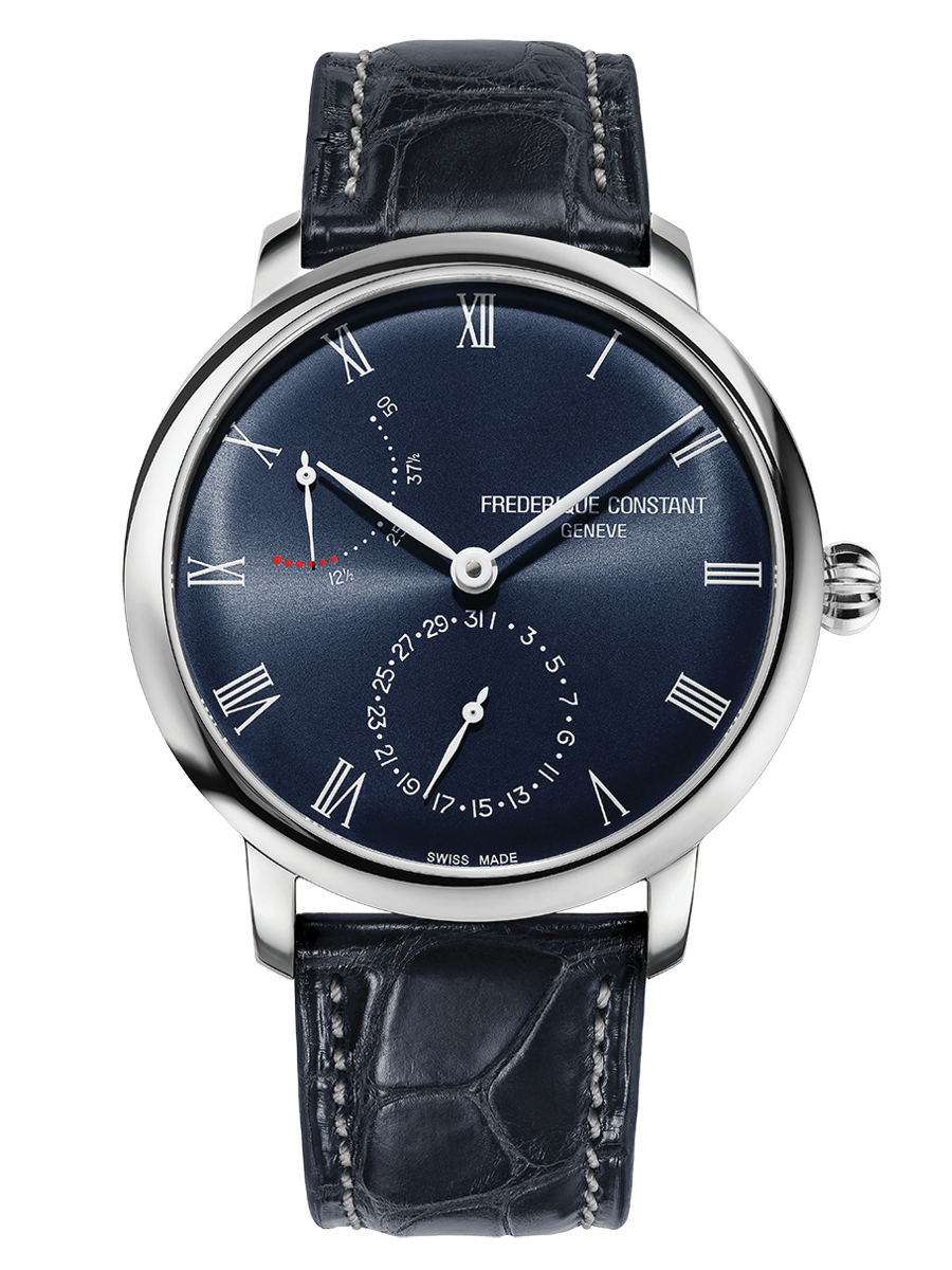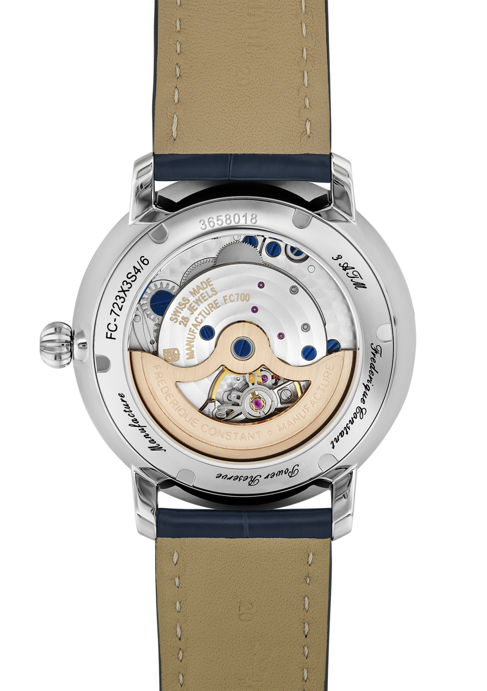 Kućište od nerđajućeg čelika sa teget aligator kožnom narukvicom. Ručno naneseni indeksi rimskih brojeva sa komplikacijom datuma i rezerve snage. Frederique Constant kalibar FC-723 automatskog mehanizma koji sadrži 28 dragulja i rezervu snage do 50 časova. Kućište prekriveno konveksnim, safirnim staklom. Veličina kućišta: 40mm.