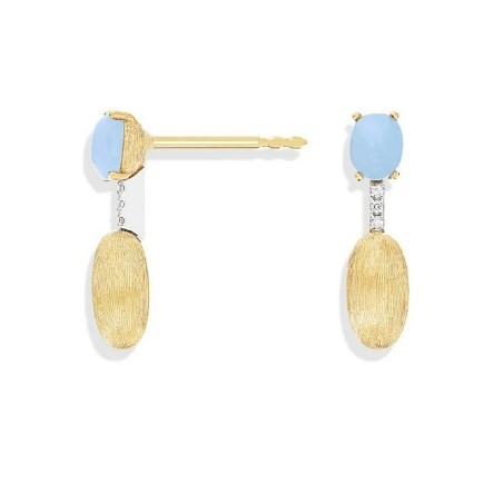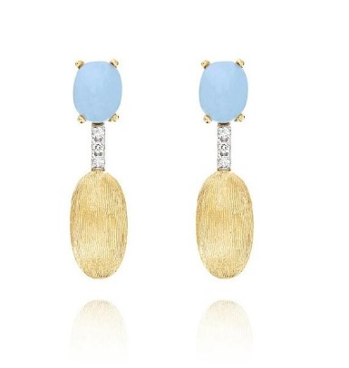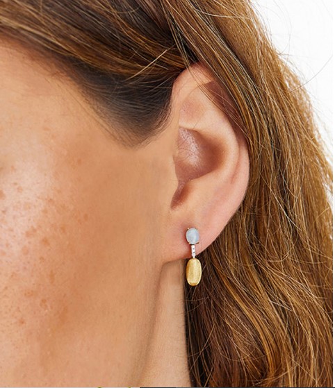 Kratke viseće minđuše čine 18- karatna zlatna kuglica izgravirane površine, mlečni akvamarin i zlatna nit između njih sa dijamantima. Kače se na uho uz pomoć iglice i šrafića. Ove minđuše su deo Azure kolekcije, poznatog italijanskog brenda nakita Nanis.