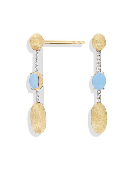 Dve zlatne kuglice, ručno gravirane spojene su mlečnim akvamarinom nitima koje su posute sitnim dijamantima. Savršen dizajn i materijali su i ovog puta ono što garantuje trajanje i nosivost u svim prilikama.