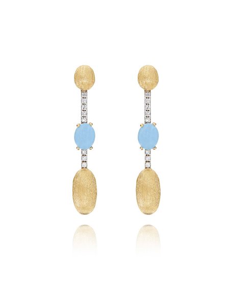 Viseće zlatne minđuše ukrašene su dijamantima i mlečno plavim akvamarinom. Na početku i na kraju minđuše su zlatne kuglice sa ručno urađenom gravurom, a na sredini je dragi kamen. Veza između zlatnih kuglica i akvamarina su niti sa dijamantima. Kačenje na uho je uz pomoć iglice i šrafića. Minđuše pripadaju kolekciji Azure, italijanskog brenda nakita Nanis.