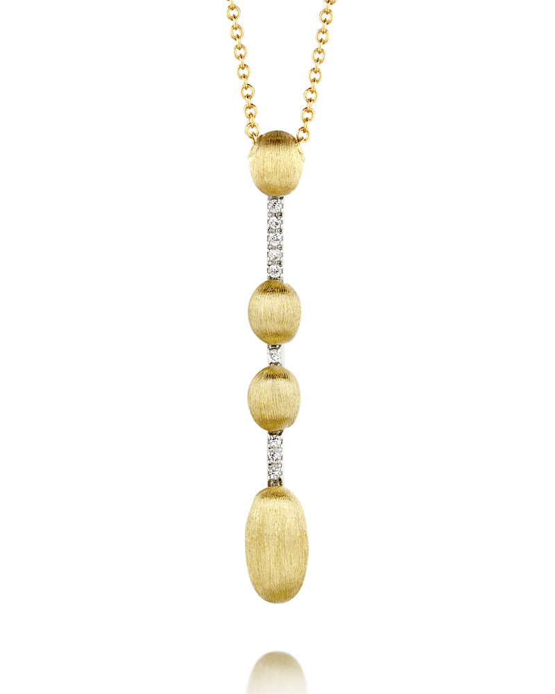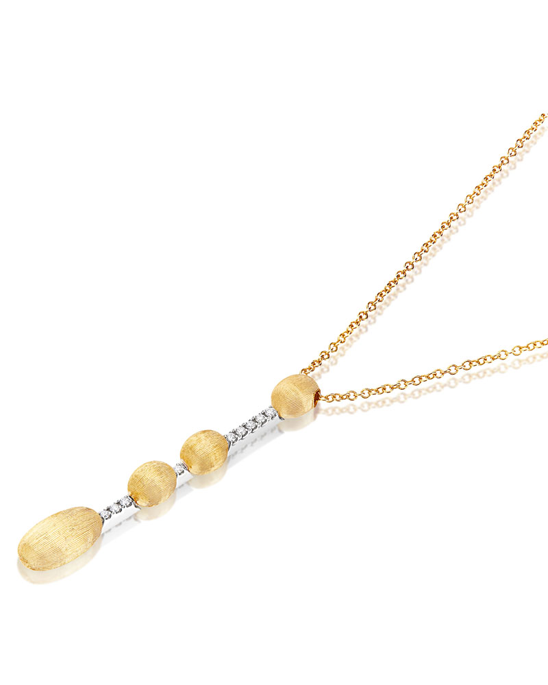 Prefinjena ogrlica od zlata sa dijamantima luksuznog brenda Nanis. Izrađena je od najkvalitetnijeg 18K žutog zlata, a krase je blistavi brilijanti izuzetne čistoće. Ova delikatna zlatna ogrlica ima raskošan privezak napravljen od kuglica zlata posebne teksture koje su povezane nizovima dijamanata.