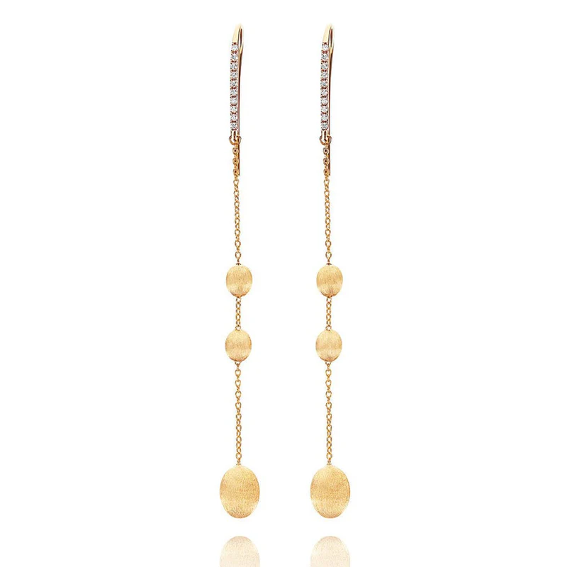 Viseće minđuše italijanskog brenda nakita Nanis pripadaju prefinjenoj kolekciji Soffio. Napravljene su od 18k žutog zlata i ukrašene su dijamantima. Zlato oblikuje tanak lanac, ali i ukrase u vidu zlatnih bisera na samom lancu. Ukupno ih je 6 na obe minđuše. Niz dijamanata prati početak minđuše, kukasti deo koji se nastavlja u iglu za ušnu resicu.