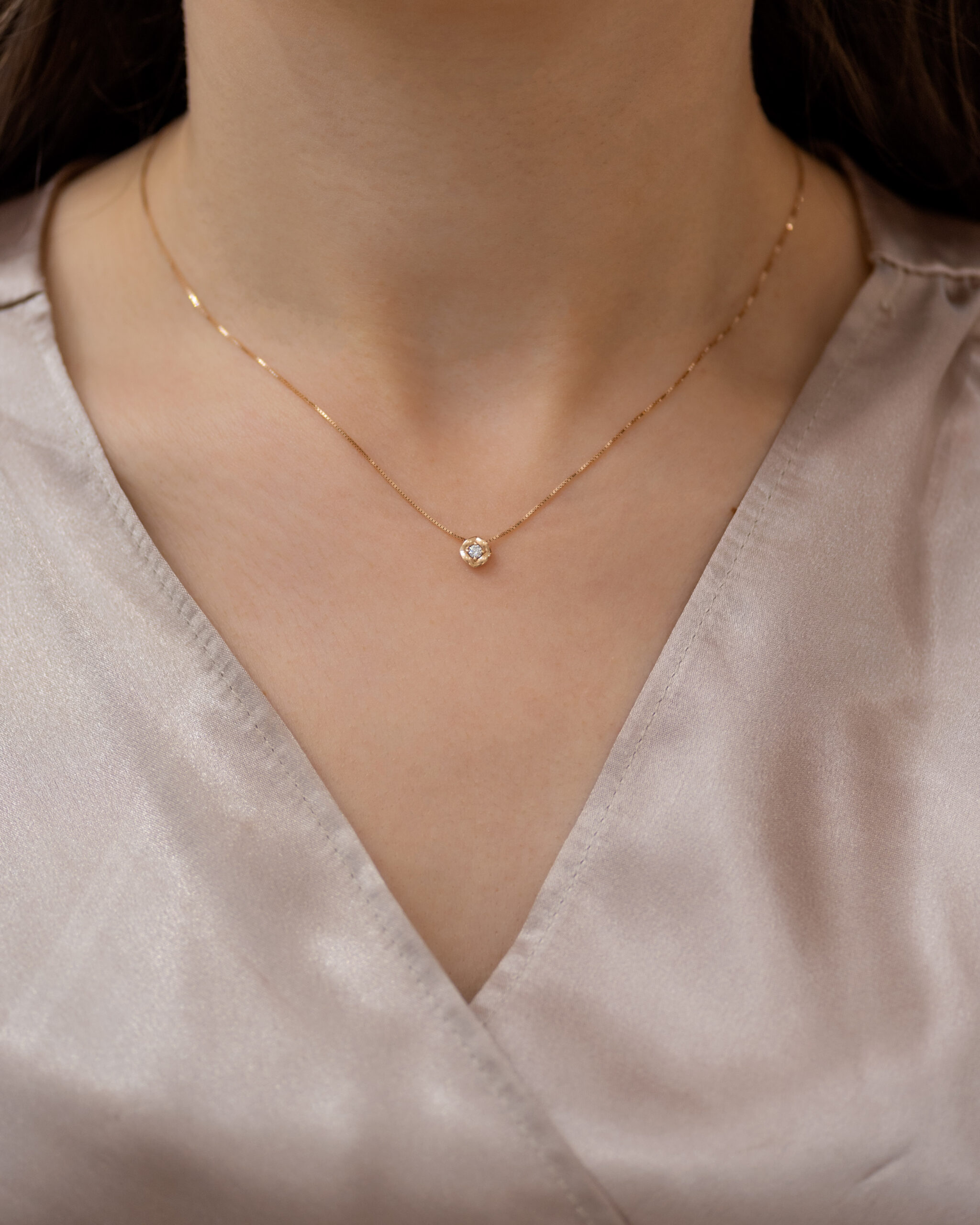 Privezak od zlata u obliku kruga koji krasi jedan jedini dijamant brilijantskog reza, postavljen u samu sredinu. Privezak je izrađen od najkvalitetnijeg 14-karatnog zlata izuzetnog sjaja i nema klasičnu alku. Umesto toga, lančić prolazi sa zadnje strane priveska, čineći ga tako lepše istaknutim na vratu. Krug je sačinjen od četiri dela koji imaju blage talase i koji se savršeno stapaju jedan u drugi. Dijamant u sredini ima četiri obla držača ravno brušenih vrhova. Zlatni privesci zlatare Andrejević mogu biti izrađeni u bilo kojoj od 3 boje zlata: beloj, roze, ili žutoj, a kombinaciju boja zlata možete sami da odaberete. Uz to, u zlatari Andrejević, nudimo Vam mogućnost da sami izaberete karatažu, čistoću i boju dijamanta kako biste bili sigurni da će privesci biti upravo onakvi kakve ste želeli. Prikazana cena, odnosi se na privezak, dok lančić možete odabrati prilikom porudžbine ili kupiti sa lančićem, koji se nalazi već pričvršćen na postojećem privesku.