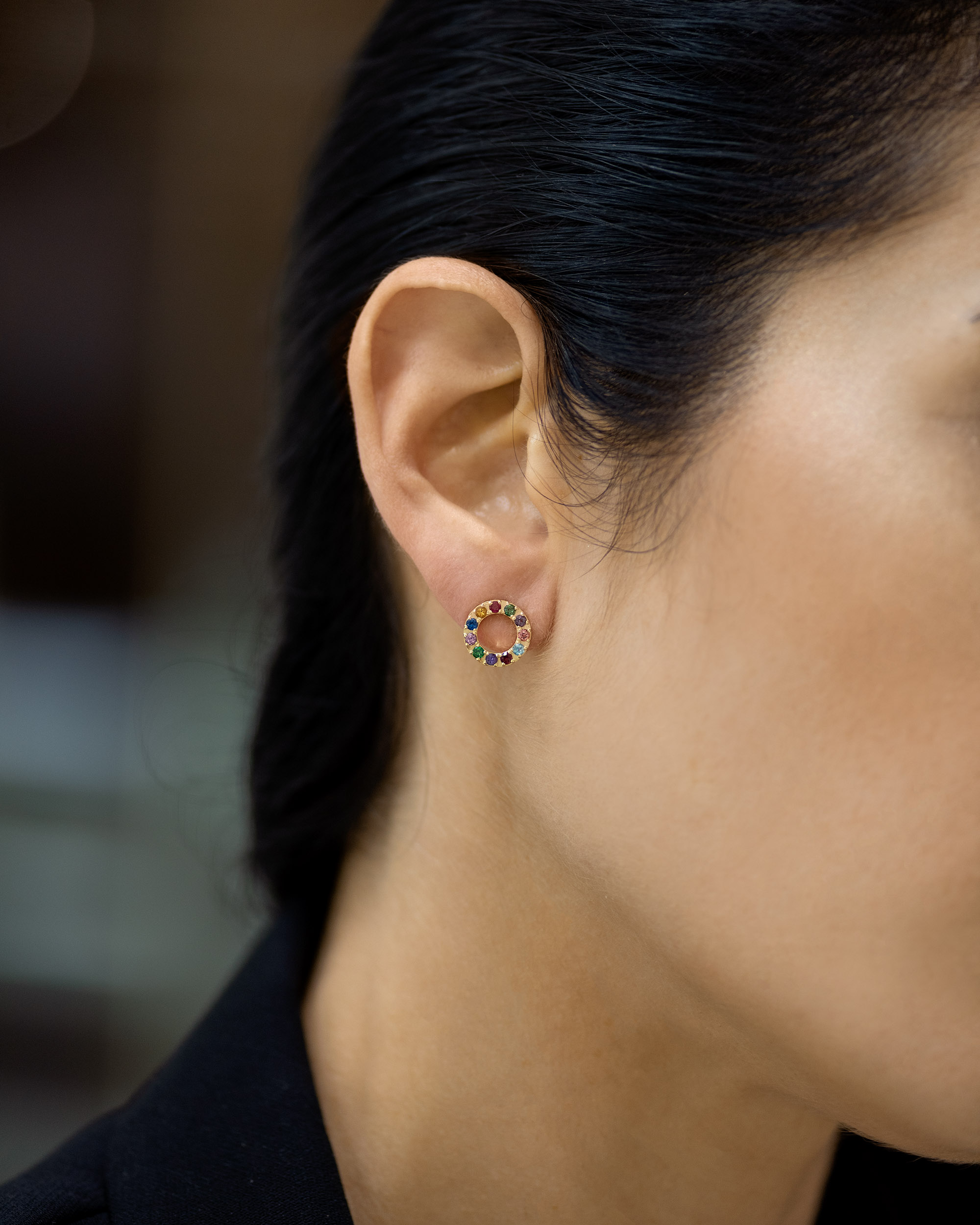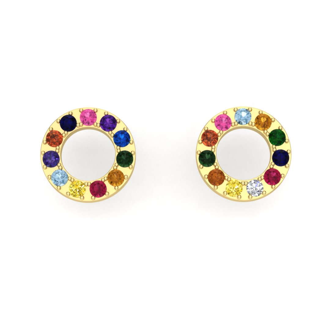 Minđuše od zlata iz kolekcije Tutti Frutti u obliku kruga koje krasi raznobojno drago kamenje. Ove zlatne minđuše su manjih dimenzija i pričvršćuju se klasičnim šrafićem. U zlatari Andrejević, nudimo Vam mogućnost da sami izaberete karatažu, čistoću i boju dijamanata, kao i boju zlata, kako biste bili sigurni da će krajnji rezultat biti upravo minđuše kakve ste želeli.