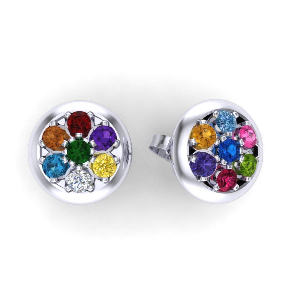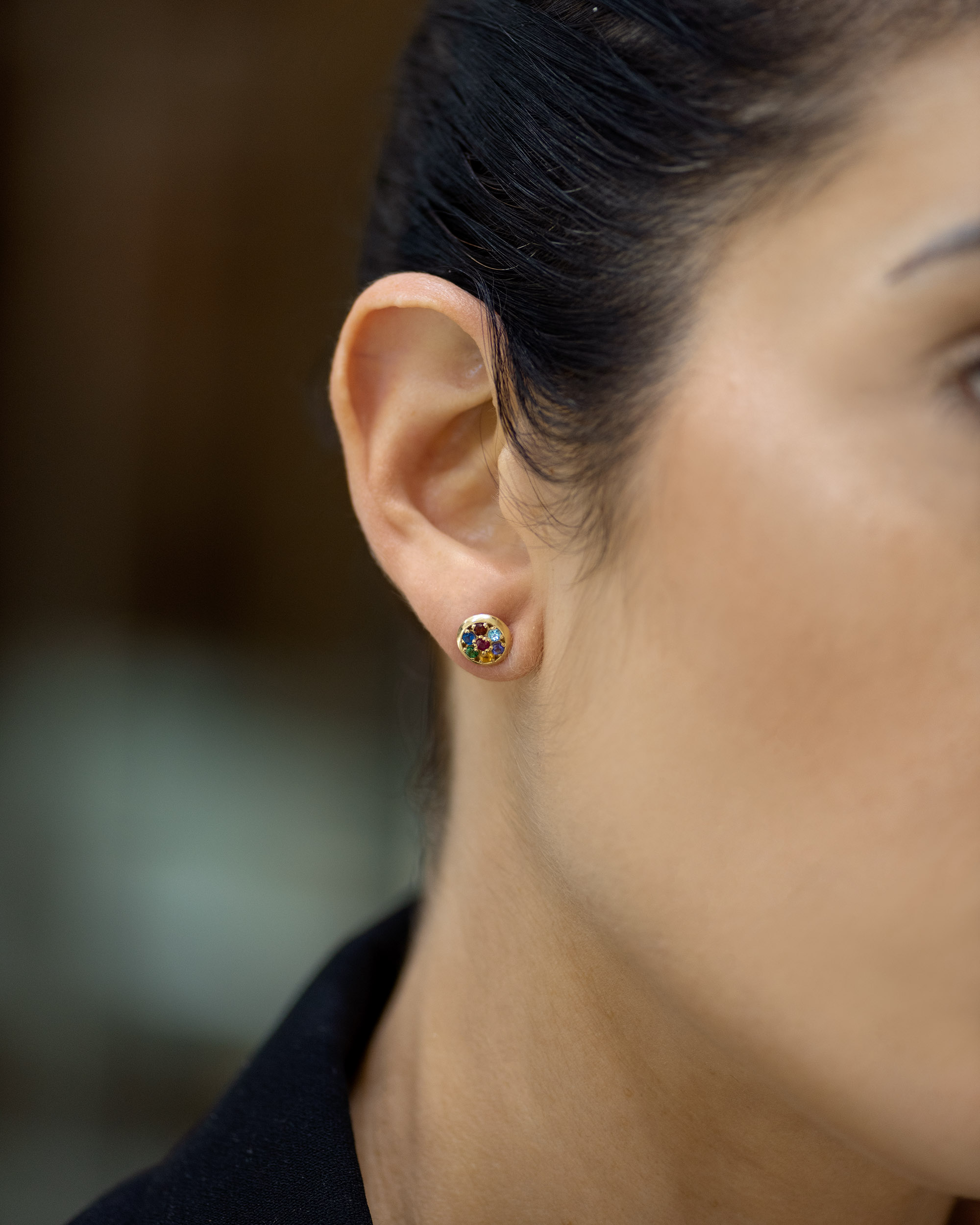 Minđuše od zlata iz kolekcije Tutti Frutti okruglog oblika koje krasi raznobojno drago kamenje. Ove zlatne minđuše su manjih dimenzija i pričvršćuju se šrafićem, dok je drago kamenjen ufasovano tako da daju oblik šarenog, blistavog cveta. U zlatari Andrejević, nudimo Vam mogućnost da sami izaberete karatažu, čistoću i boju dijamanata, kao i boju zlata, kako biste bili sigurni da će krajnji rezultat biti upravo minđuše kakve ste želeli.