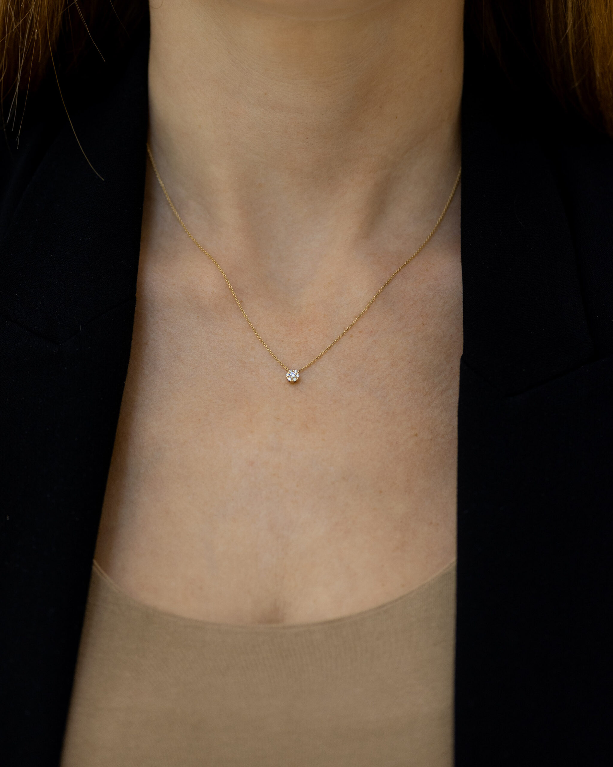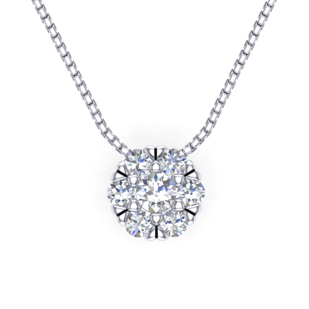 Privezak od zlata u obliku cveta koji krasi čak sedam blistavih brilijanata. Privezak je izrađen od zlata izuzetnog kvaliteta i nema klasičnu alku. Centralni brilijant je neznatno veće karataže i ima šest držača koje nalikuju laticama cveta. Okružuje ga šest manjih brilijanata postavljenih u krug tako da je krajnji rezultat dijamantski privezak u obliku svetlucavog cveta. Zlatni privesci zlatare Andrejević mogu biti izrađeni u bilo kojoj od tri boje zlata: beloj, roze, ili žutoj. Uz to, u zlatari Andrejević, nudimo Vam mogućnost da sami izaberete karatažu, čistoću i boju dijamanta kako biste bili sigurni da će privesci biti upravo onakvi kakve ste želeli.