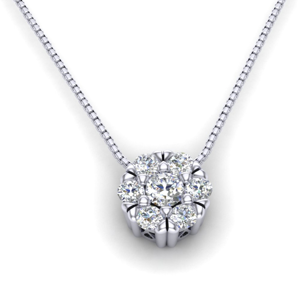 Privezak u obliku cveta napravljen je od najkvalitetnijeg 14-karatnog zlata i bogato ukrašen dijamantima. Veći centralni dijamant ima šest držača, dok šest manjih dijamanata koji ga okružuju imaju po četiri. Zlatni privesci zlatare Andrejević mogu biti izrađeni u bilo kojoj od 3 boje zlata: beloj, roze, ili žutoj. Uz to, u zlatari Andrejević, nudimo Vam mogućnost da sami izaberete karatažu, čistoću i boju dijamanta kako biste bili sigurni da će privesci biti upravo onakvi kakve ste želeli.