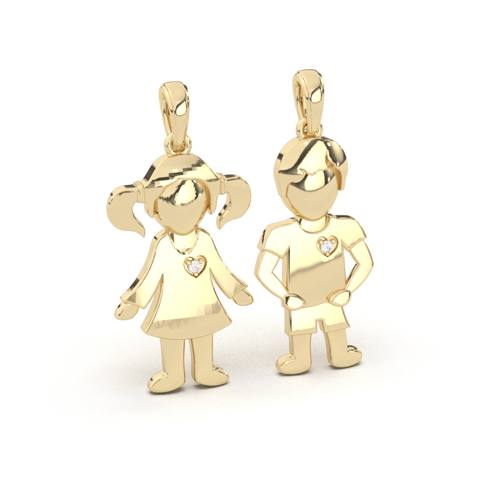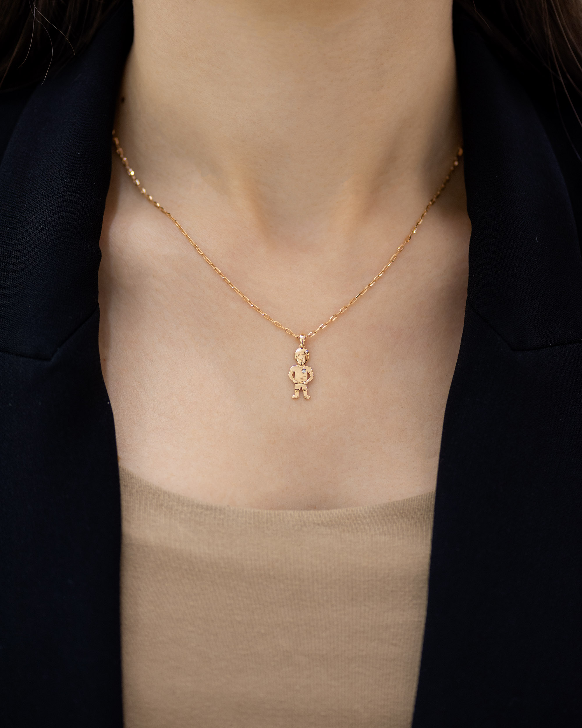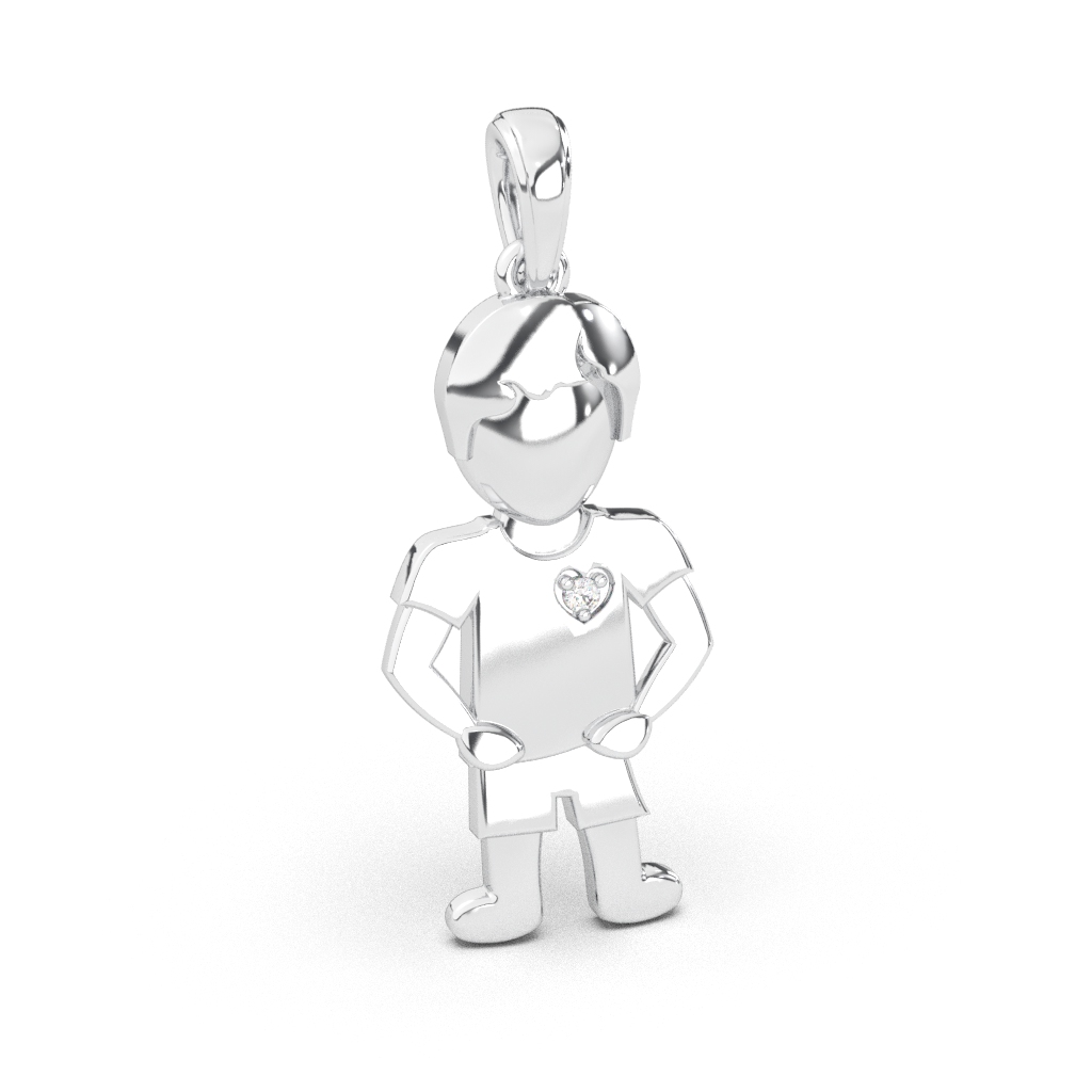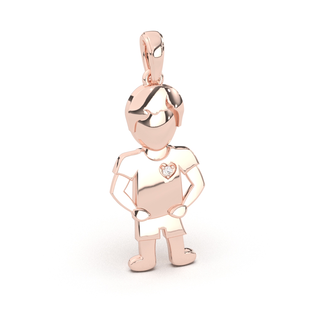 Privezak od zlata u obliku siluete dečaka, ukrašen jednim blistavim brilijantom. Privezak dečak ima kratku kosu i nosi šorc sa kratkom majicom. Na levoj strani grudi, dečak ima srce u kome se nalazi brilijant. Privezak ima jednostavnu, klasičnu alku. Kada su u pitanju naši privesci, zlatara Andrejević Vam nudi mogućnost da sami izaberete karatažu, čistoću i boju dijamanta i drugog dragog kamenja, kao i boju zlata, kako biste bili sigurni da će krajnji rezultat biti upravo privezak kakav ste želeli.