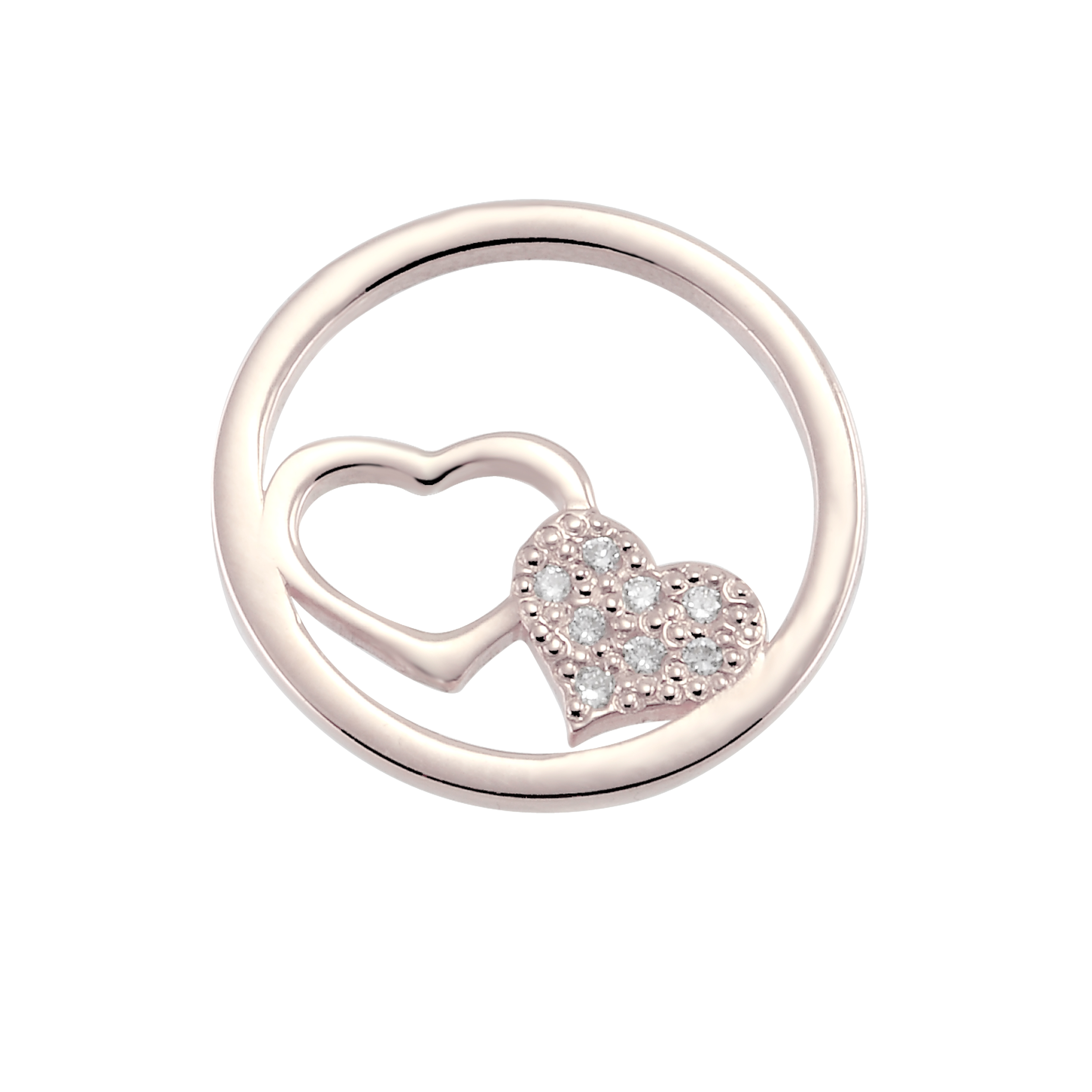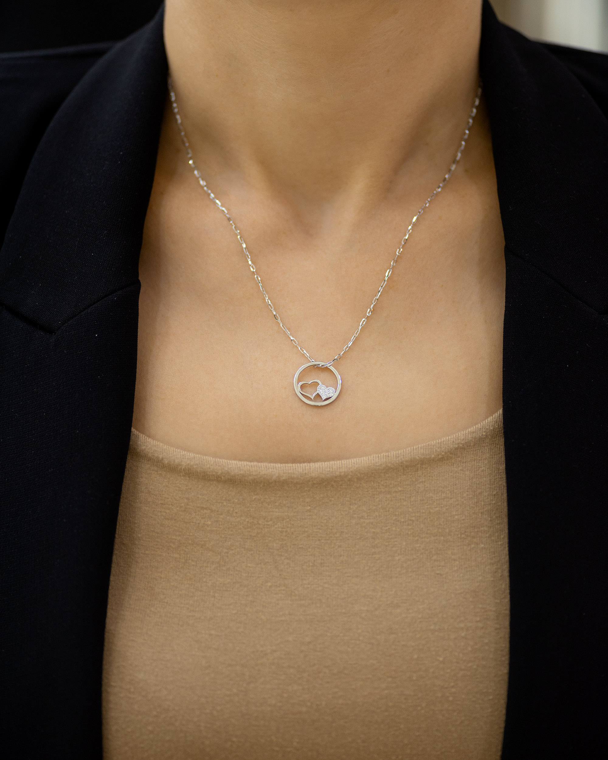 Privezak od zlata u obliku kruga u kome se nalaze dva srca. Dva srca su smeštena jedno do drugog, jedno je optočeno brilijantima, dok je drugo otvoreno u sredini. Ovaj privezak je napravljen od zlata najvišeg kvaliteta i nema klasičnu alku za lančić. Zlatni privesci zlatare Andrejević mogu biti izrađeni u bilo kojoj od 3 boje zlata: beloj, roze, ili žutoj, a kombinaciju boja zlata možete sami da odaberete . Uz to, u zlatari Andrejević, nudimo Vam mogućnost da sami izaberete karatažu, čistoću i boju dijamanta kako biste bili sigurni da će privesci biti upravo onakvi kakve ste želeli.